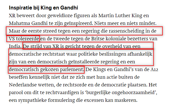 Hij had ook kunnen schrijven "De strijd van King was gericht tegen de overheid van een democratische rechtstaat waar politieke beslissingen afhankelijk waren van een democratisch geïnstalleerde regering en een democratisch gekozen parlement, en de strijd van XR is gericht tegen een regering die de onleefbaarheid van deze planeet tolereert."