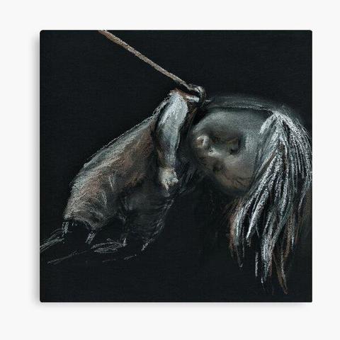 (ICYMI) "Creepy Cute Black Scary Doll Dark Art" Canvas Print for Sale by zhydarya: A modern design based on my original horror drawing of a creepy possessed doll hanging on a hook. The drawing is part of a Gothic art series created in scope of the Halloween Drawtober challenge.