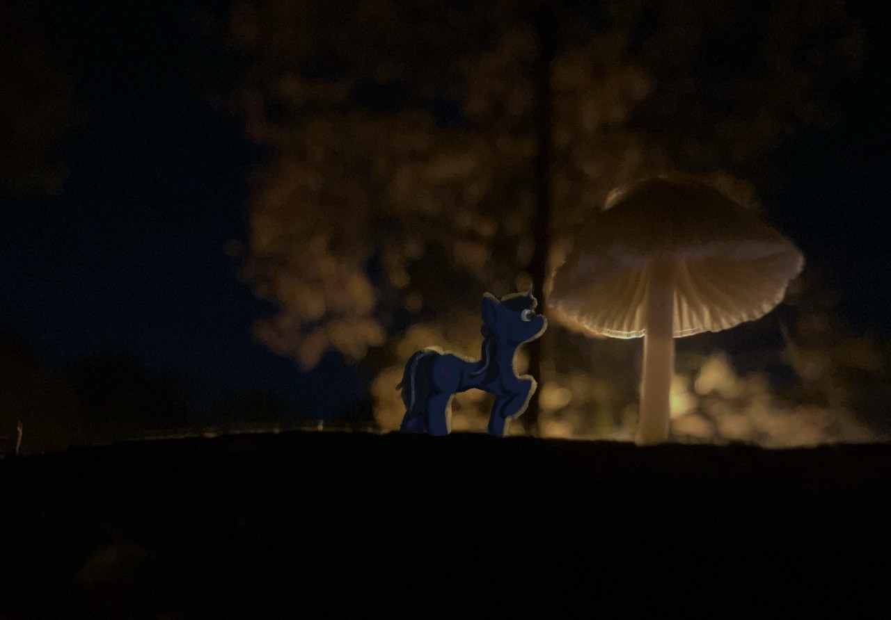 Eve discovers a beautifully lit mushroom.