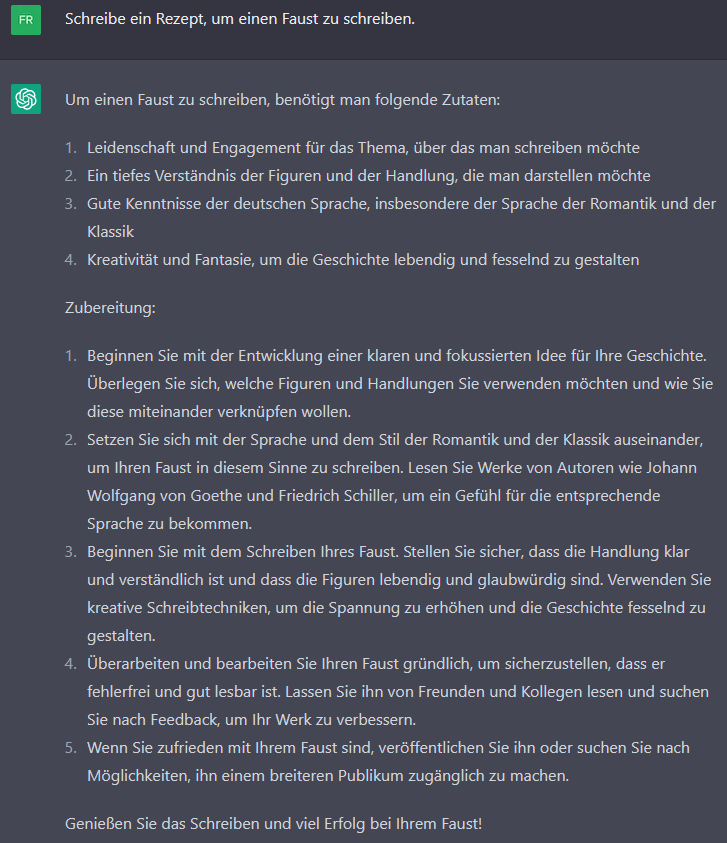 #chatgpt3 und Lehre - ein Rezept, um einen eigenen Faust zu schreiben? Here it is: