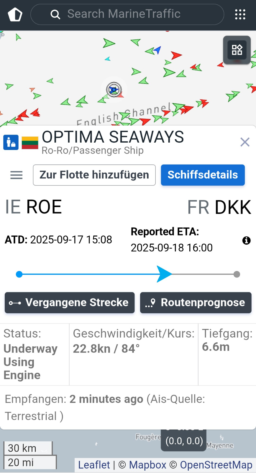 Gegen 4:00 Uhr werde ich wach, es schaukelt nichts mehr, naja nicht so viel jedenfalls. Die Seite #marinetraffic gibt die Erklärung: wir sind um Englands Spitze herum und fahren jetzt zwischen #GB und #Festland auf ruhigerer See... in gut 12 Stunden sind wir da.