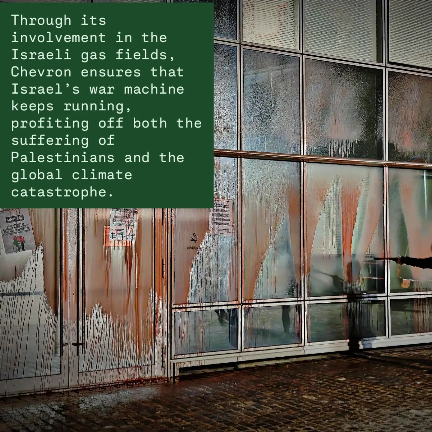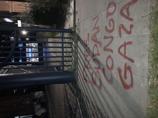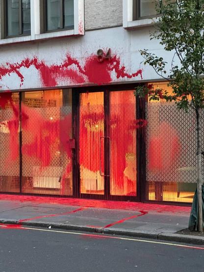 They destroyed entrances, glass panels, security cameras and ID card readers, then doused the facade in red paint to symbolise the blood of murdered Palestinians.
