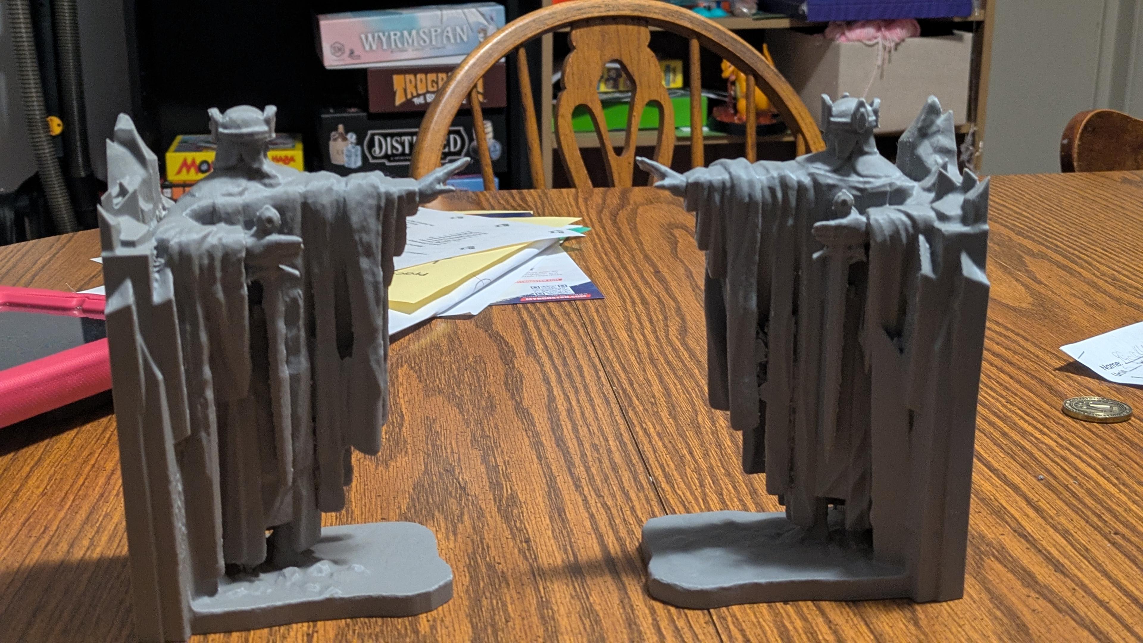 I've been wanting to try this print for a while. The Gates of Argonath are the entrance to Gondor on the Anduin River in Arda in the 3rd Age of Lord of the Rings. It's perhaps the most prolific monument depicted by Tolkien. I made them as book ends for one of my book shelves. Despite all the supports, I'm happy with how it turned out. #3dprinting #lordoftherings