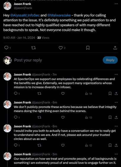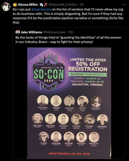 So a vendor chose to advertise their upcoming conference at Shmoo. 2024 and we still have all white male speaker pools for these events. WIATF?? Then their COO weighed in exactly as I predicted they would without any sense of irony at all. So here's a link to the full thread of my detailed response.