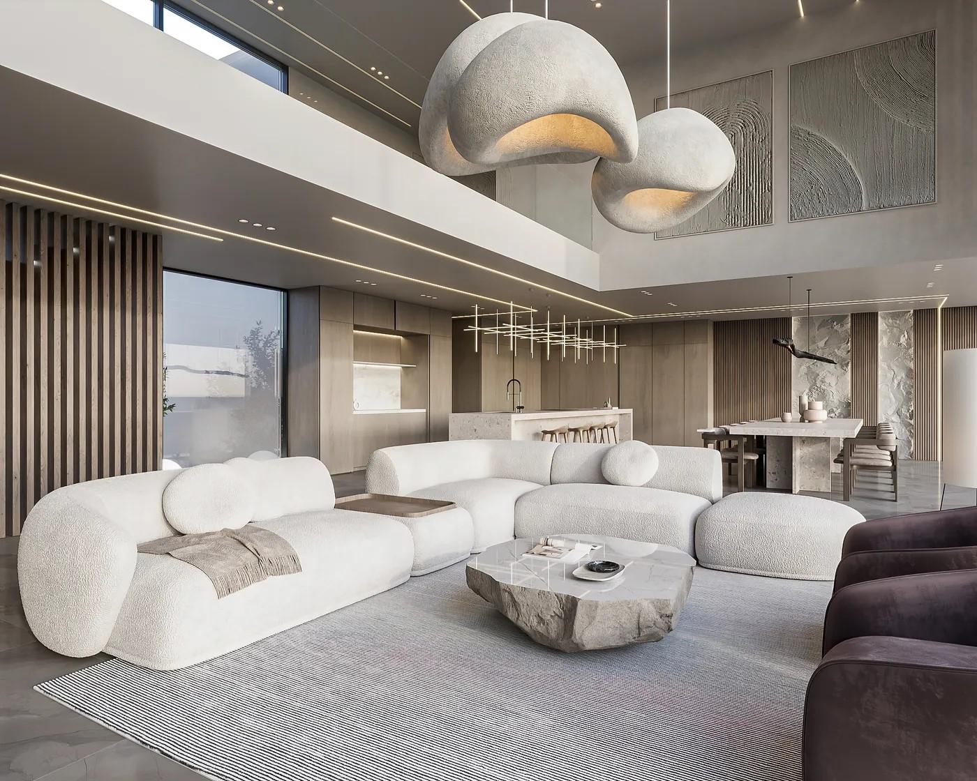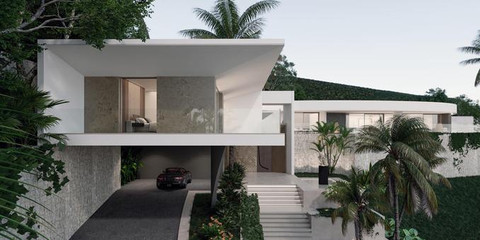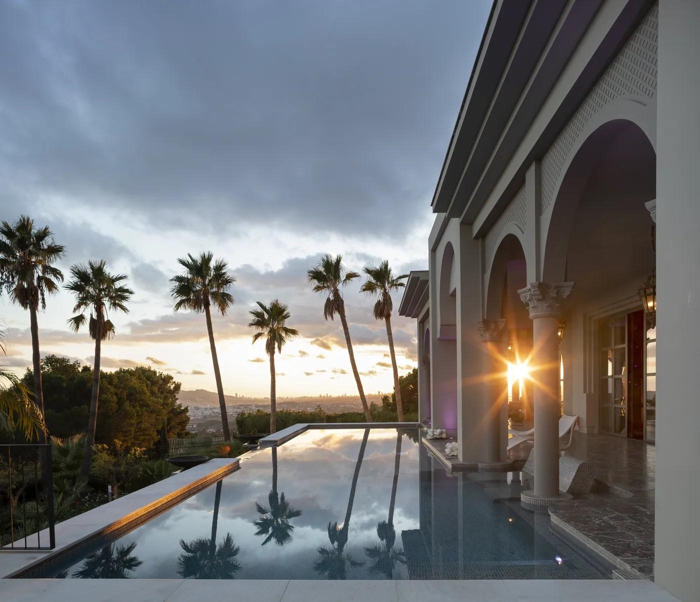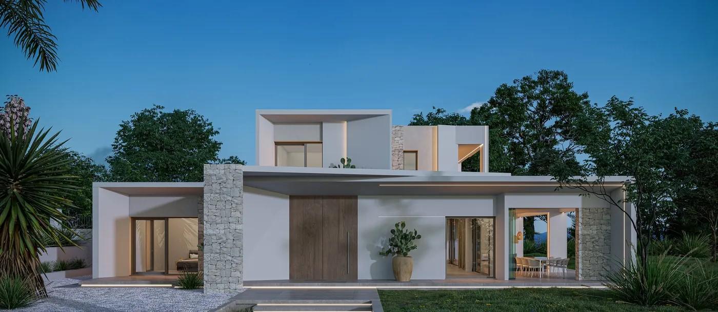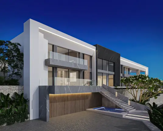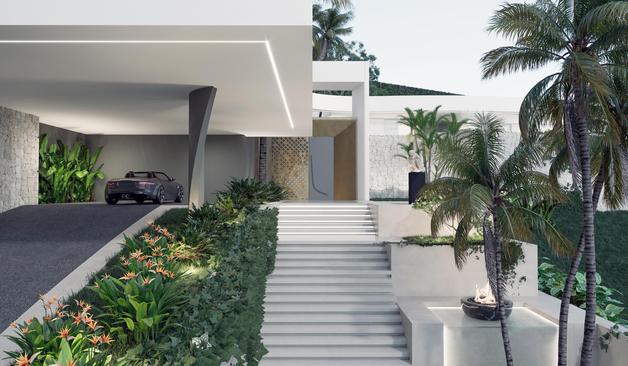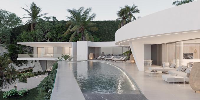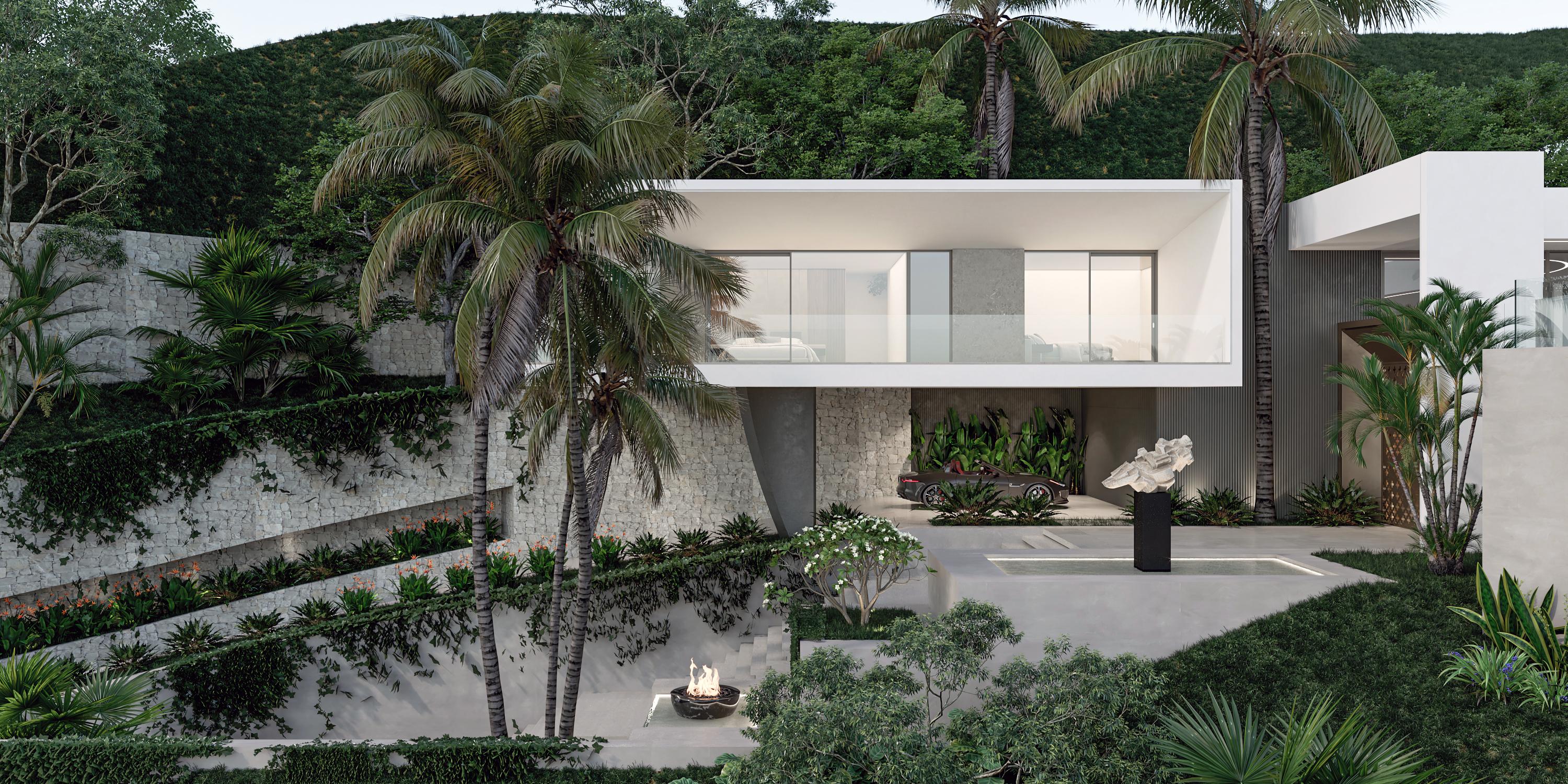 A cliffside villa by Anvana Architects combines crisp white stucco volumes with dark marble fins, framing full-height windows. A cantilevered pool pavilion, featuring a waterfall-edge design and ribbon LED lighting, accentuates the linear form while embracing panoramic views of the Mediterranean.