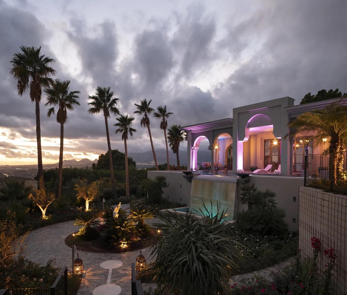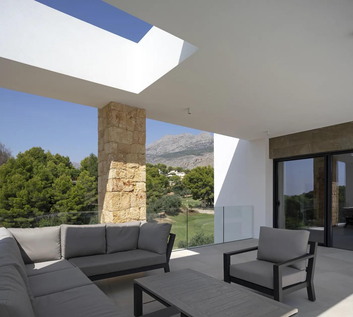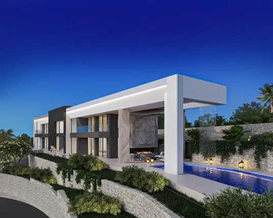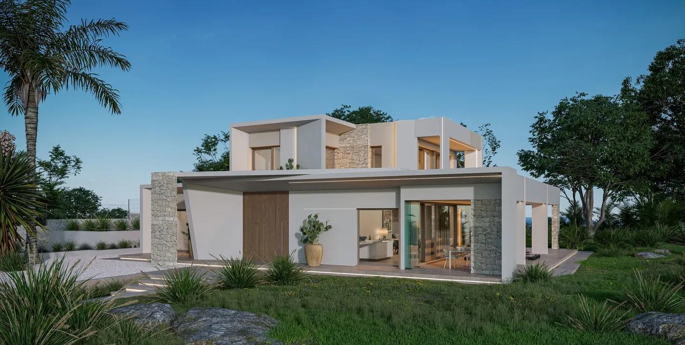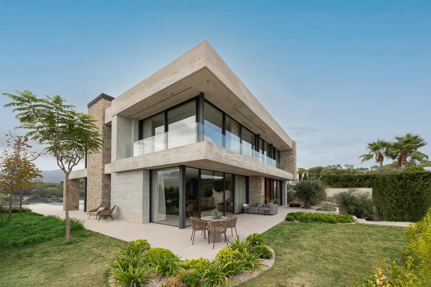 A cliffside villa by Anvana Architects combines crisp white stucco volumes with dark marble fins, framing full-height windows. A cantilevered pool pavilion, featuring a waterfall-edge design and ribbon LED lighting, accentuates the linear form while embracing panoramic views of the Mediterranean.