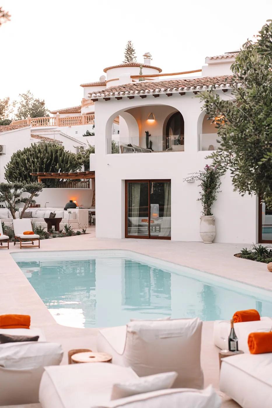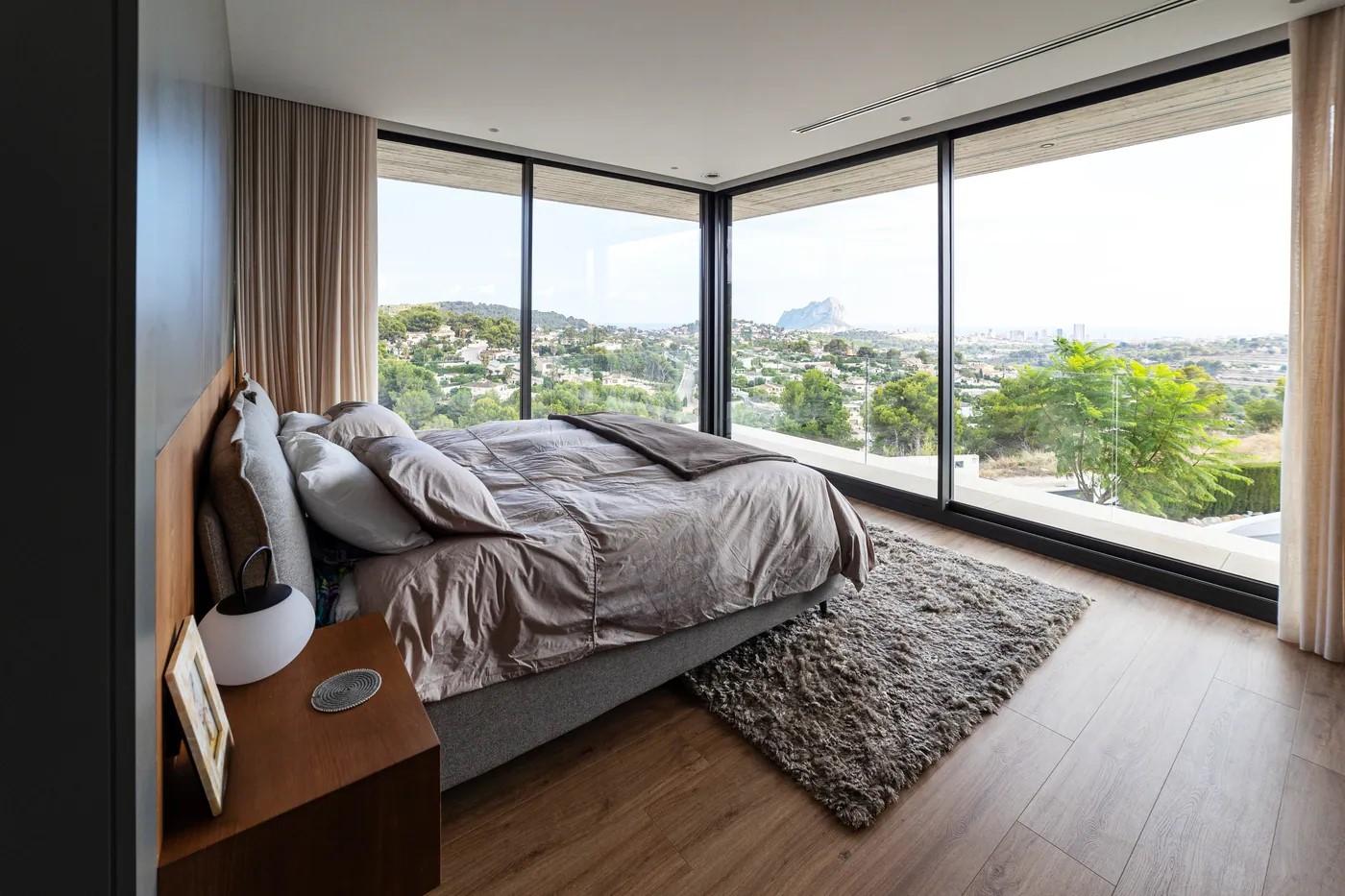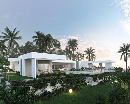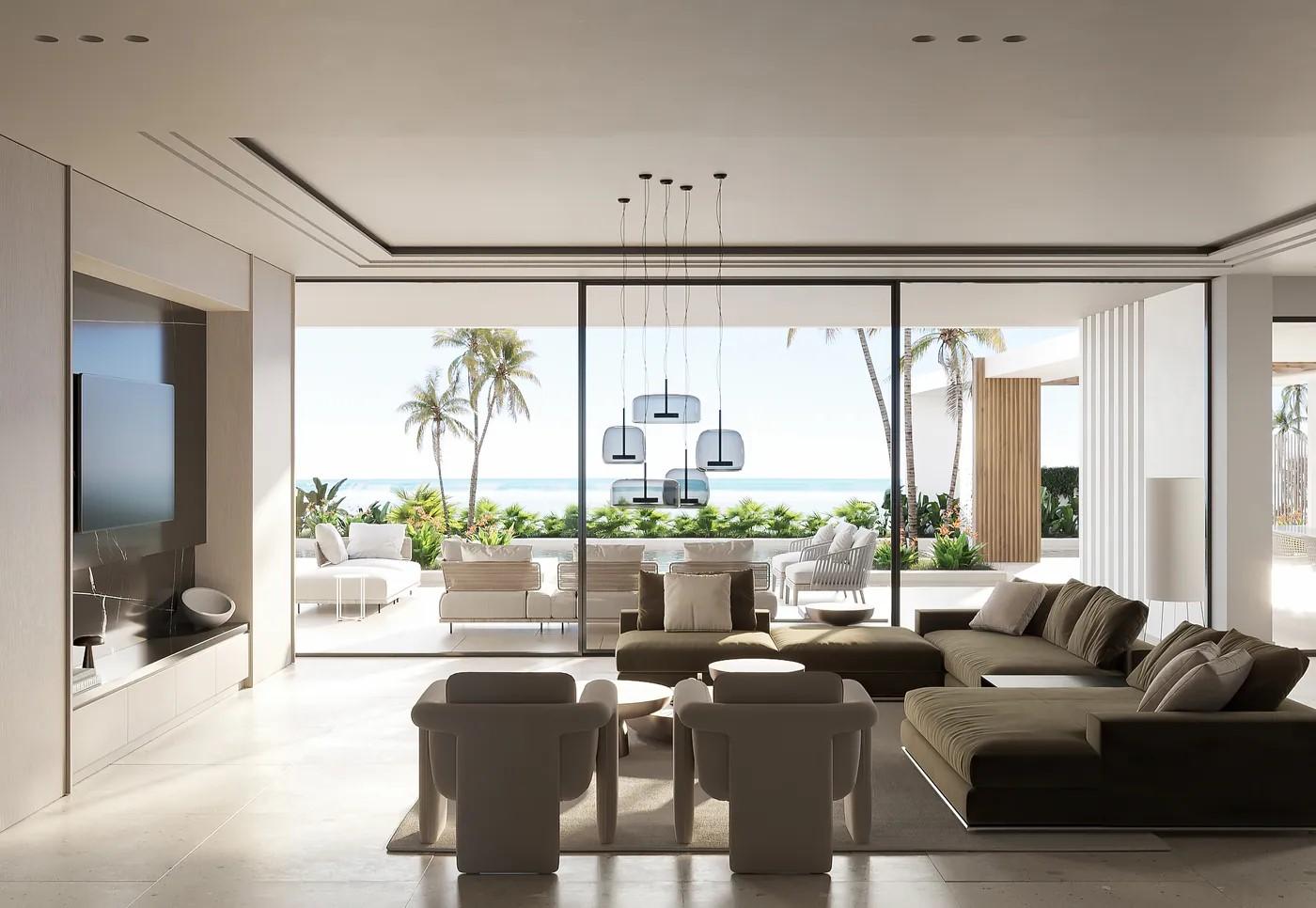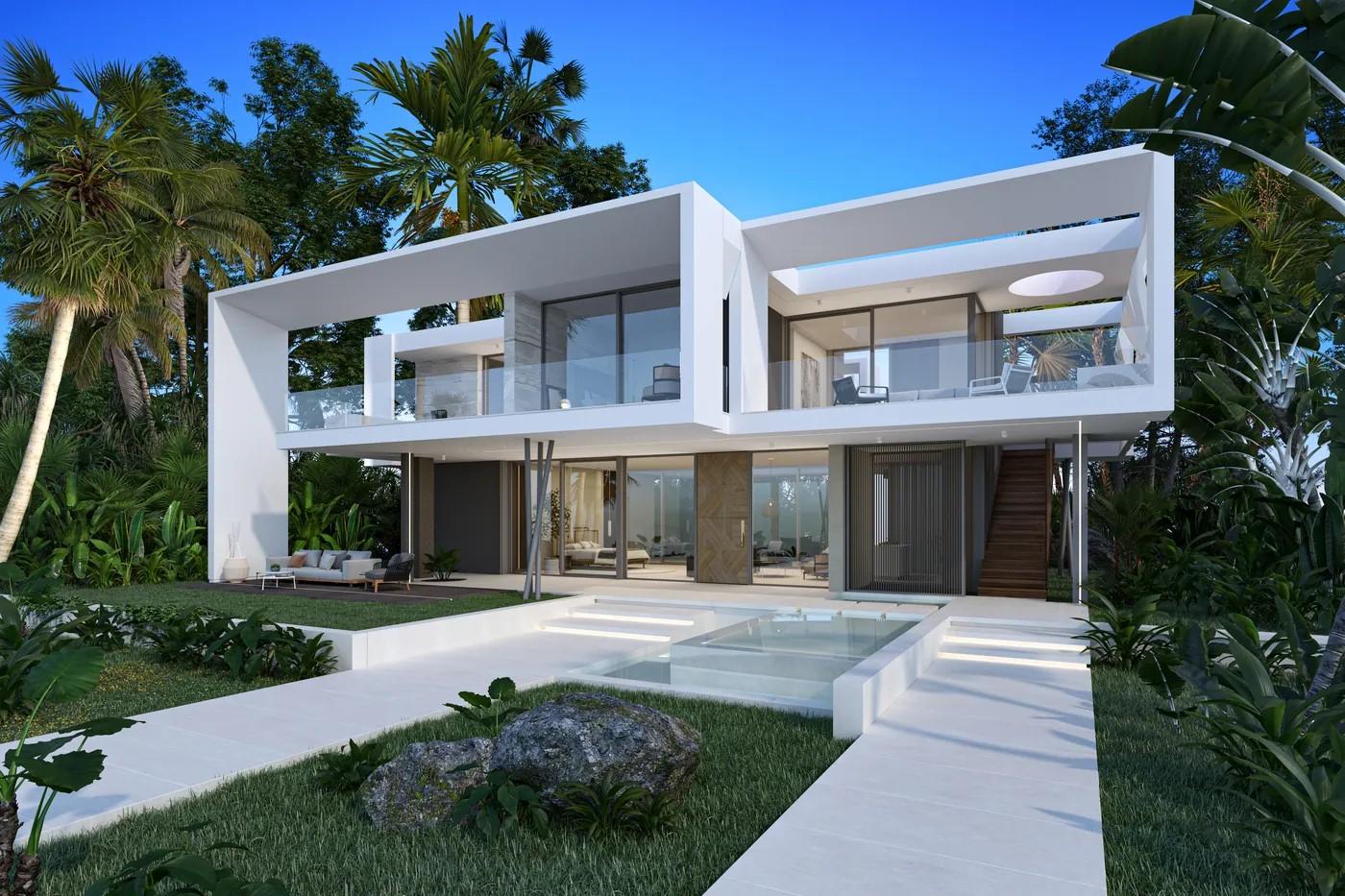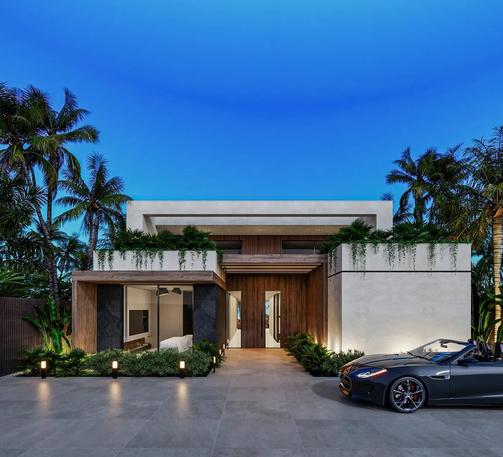 A cliffside villa by Anvana Architects combines crisp white stucco volumes with dark marble fins, framing full-height windows. A cantilevered pool pavilion, featuring a waterfall-edge design and ribbon LED lighting, accentuates the linear form while embracing panoramic views of the Mediterranean.