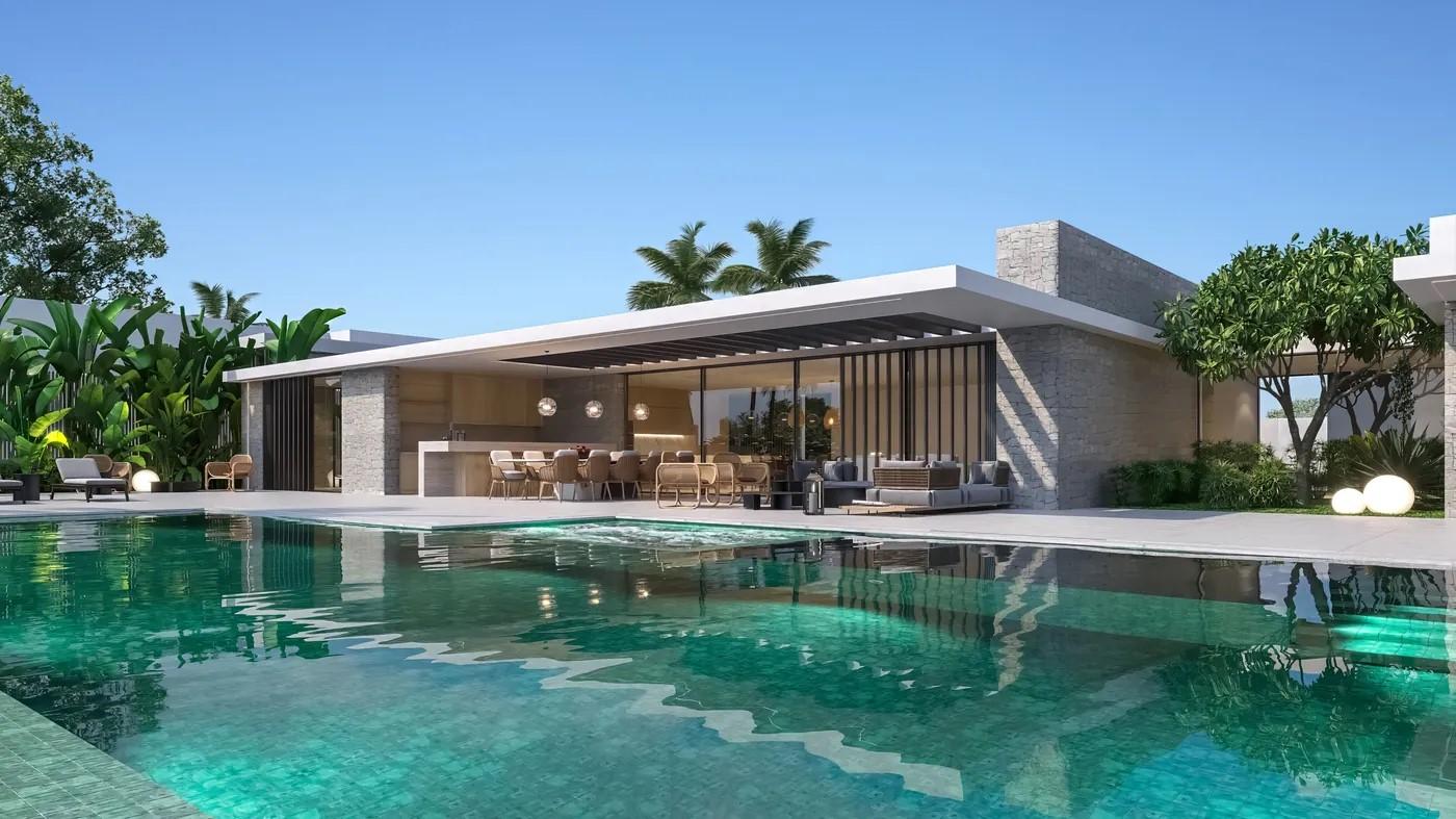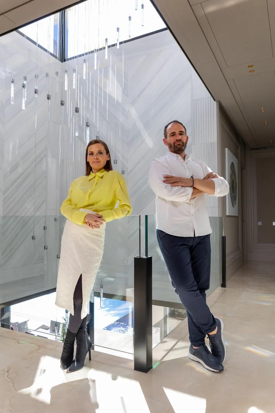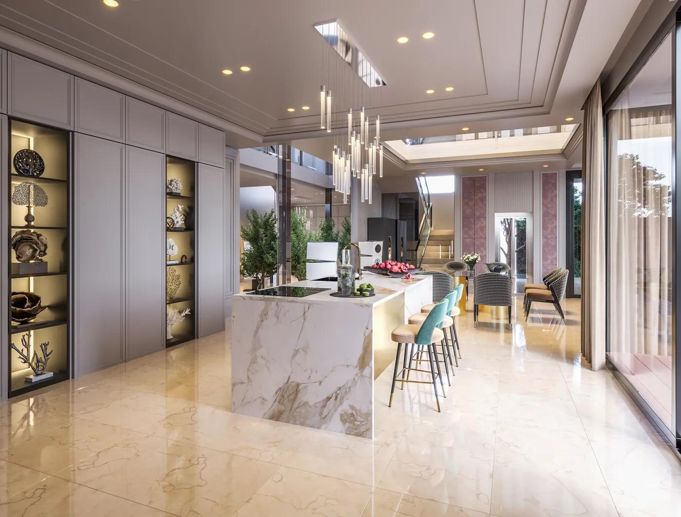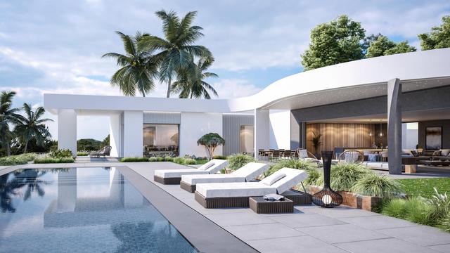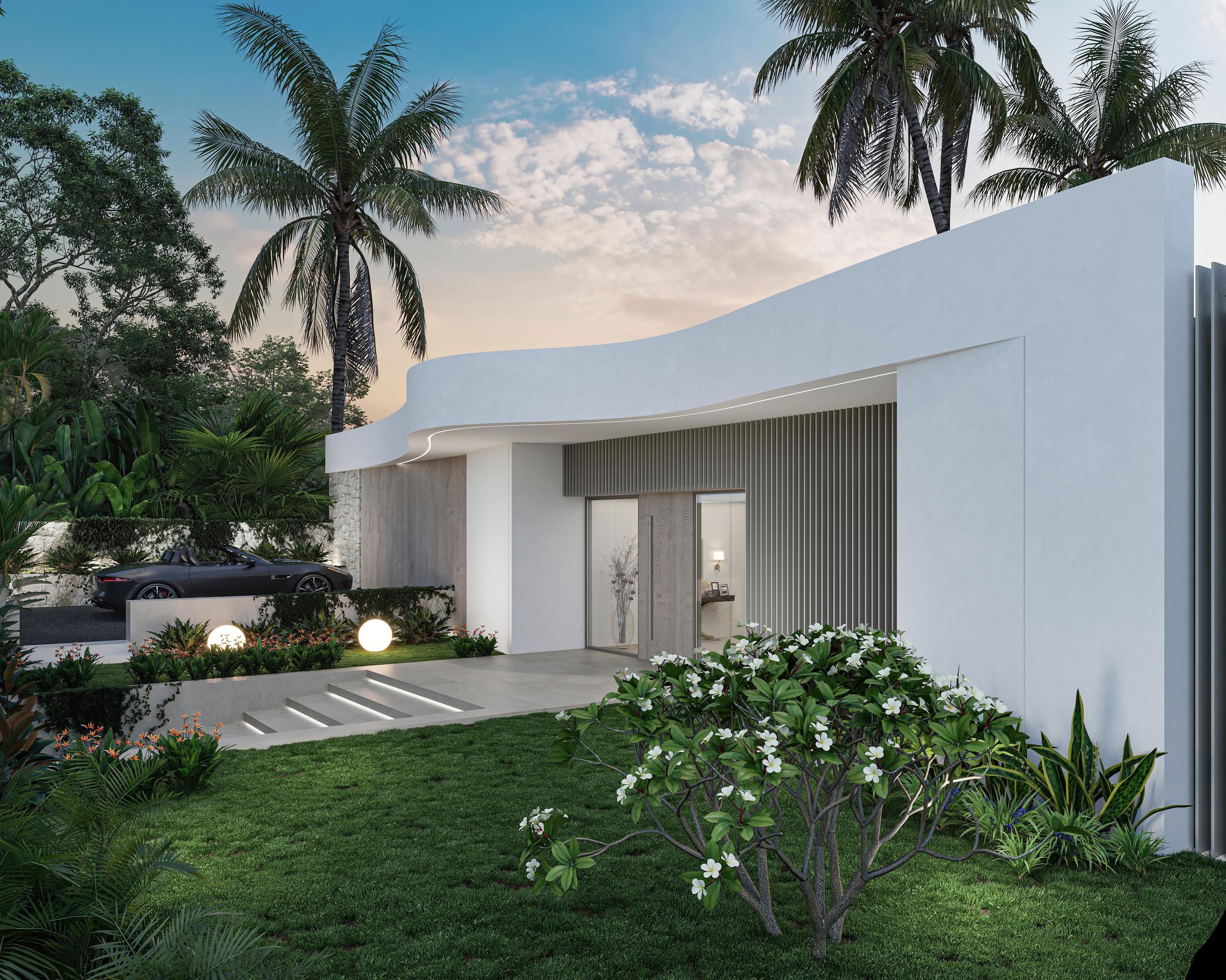A cliffside villa by Anvana Architects combines crisp white stucco volumes with dark marble fins, framing full-height windows. A cantilevered pool pavilion, featuring a waterfall-edge design and ribbon LED lighting, accentuates the linear form while embracing panoramic views of the Mediterranean.