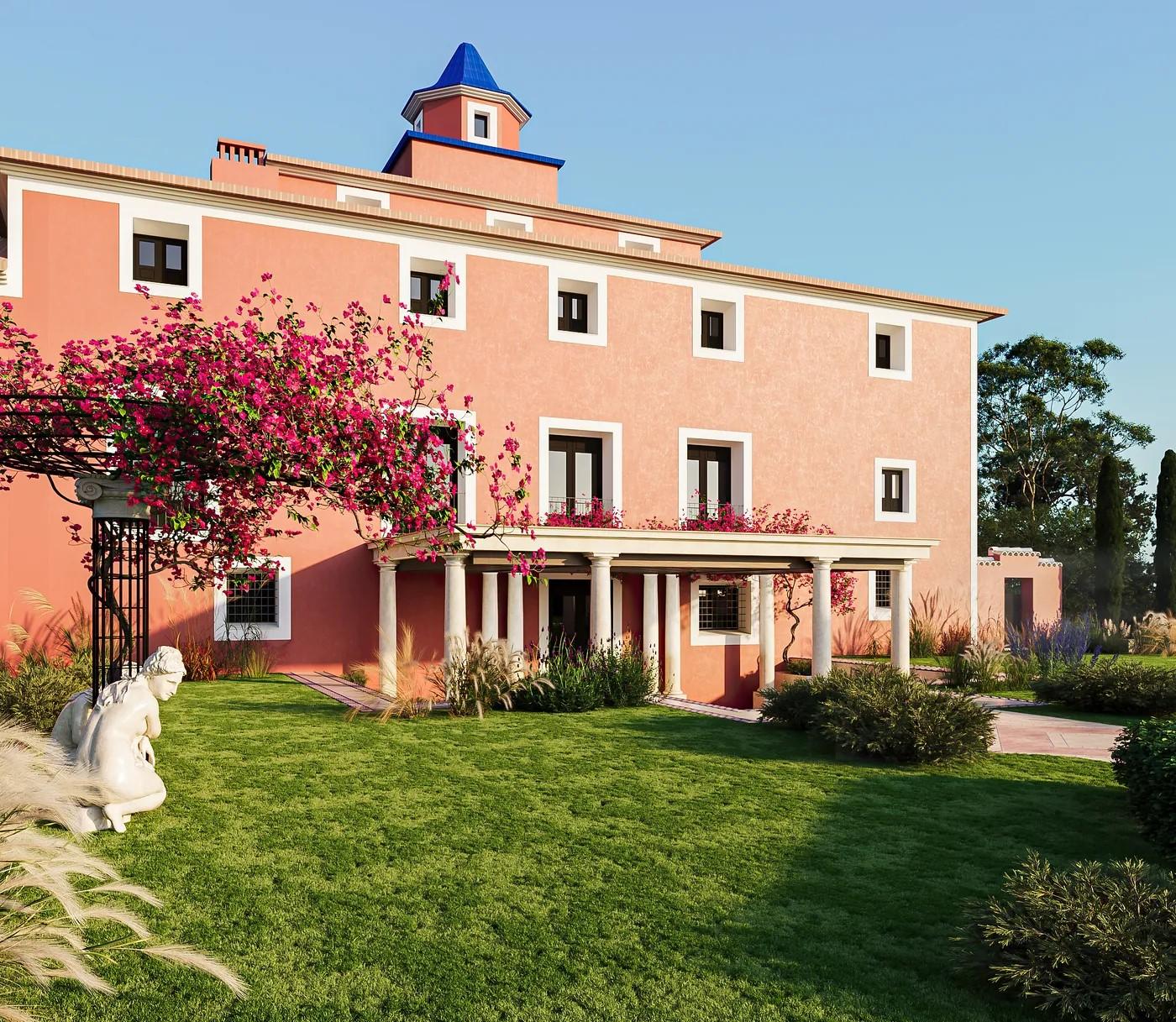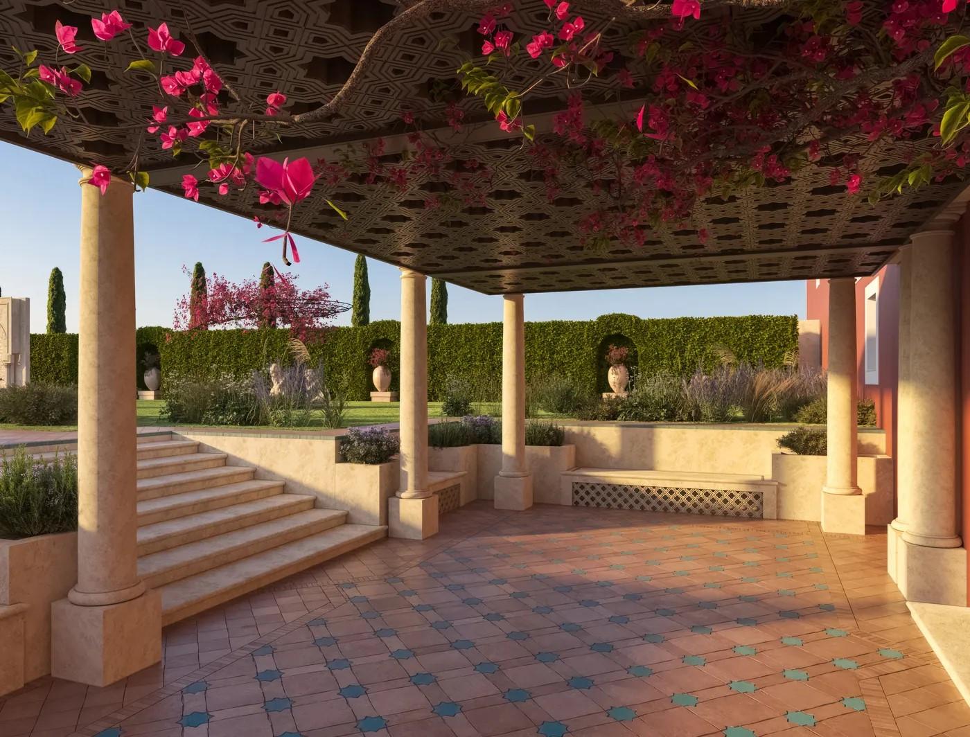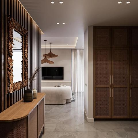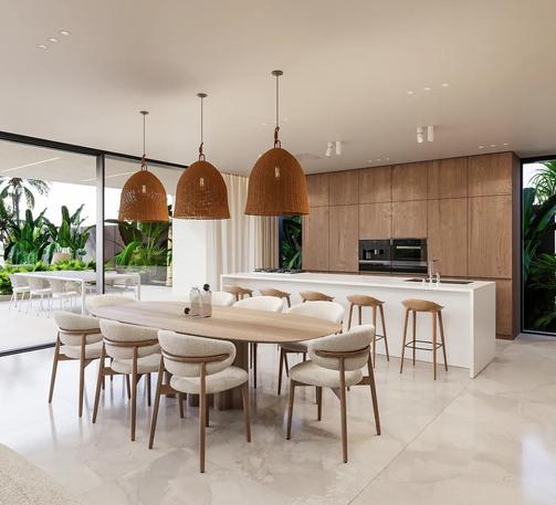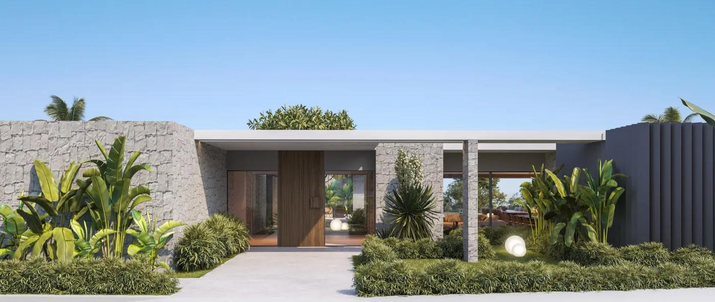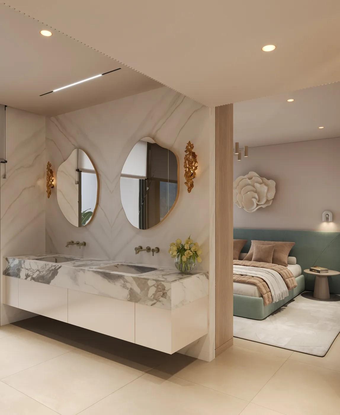 A cliffside villa by Anvana Architects combines crisp white stucco volumes with dark marble fins, framing full-height windows. A cantilevered pool pavilion, featuring a waterfall-edge design and ribbon LED lighting, accentuates the linear form while embracing panoramic views of the Mediterranean.