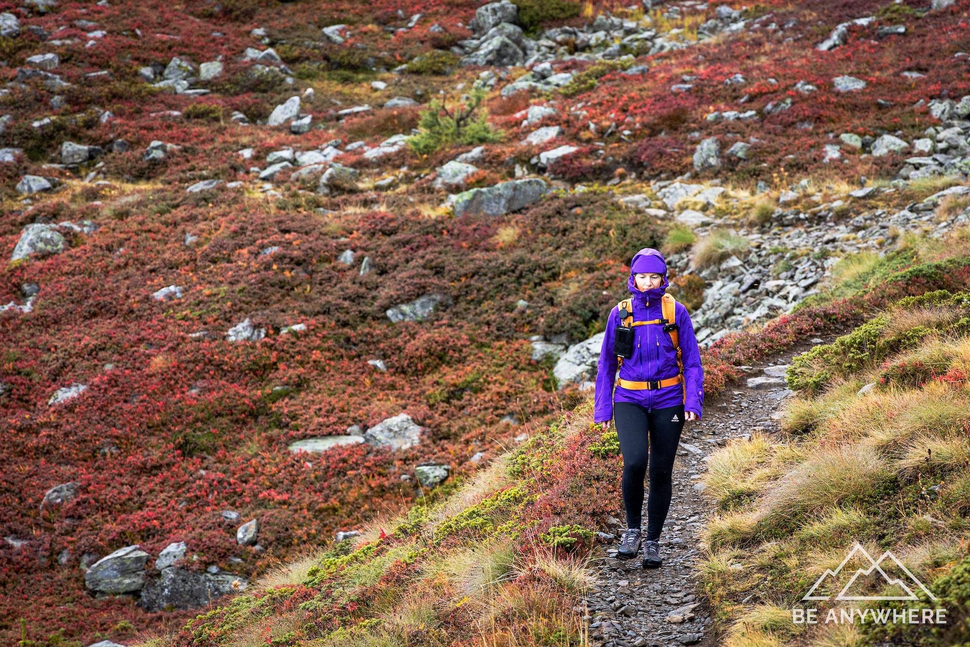 Wanderin in Regenkleidung auf einem schmalen Bergpfad, umgeben von herbstlich verfärbtem, nassem Heideland und Felsblöcken. Die Stimmung ist ruhig und zurückgezogen.