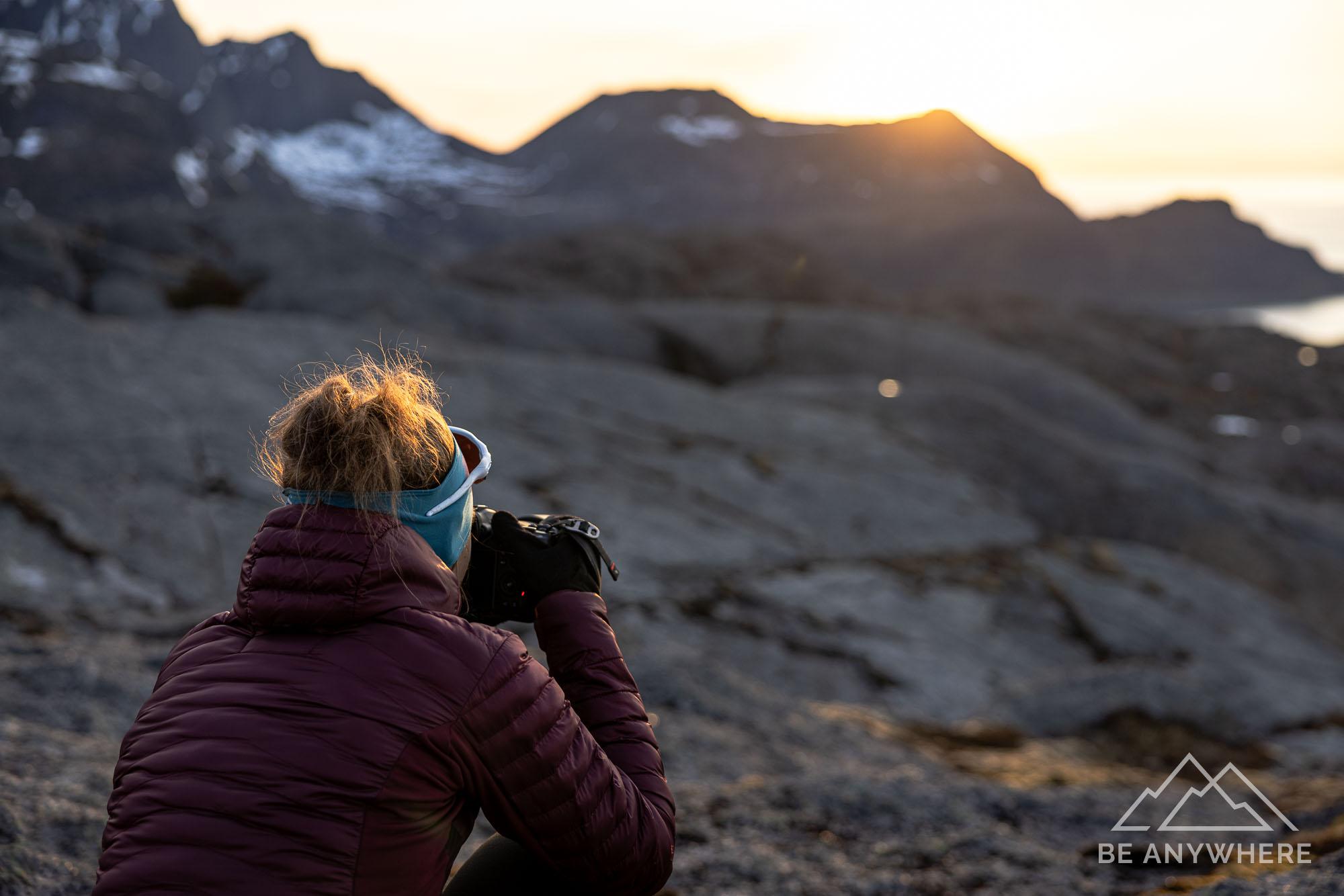 Woman with a camera capturing the sunset.Sunset on Lofoten islands.