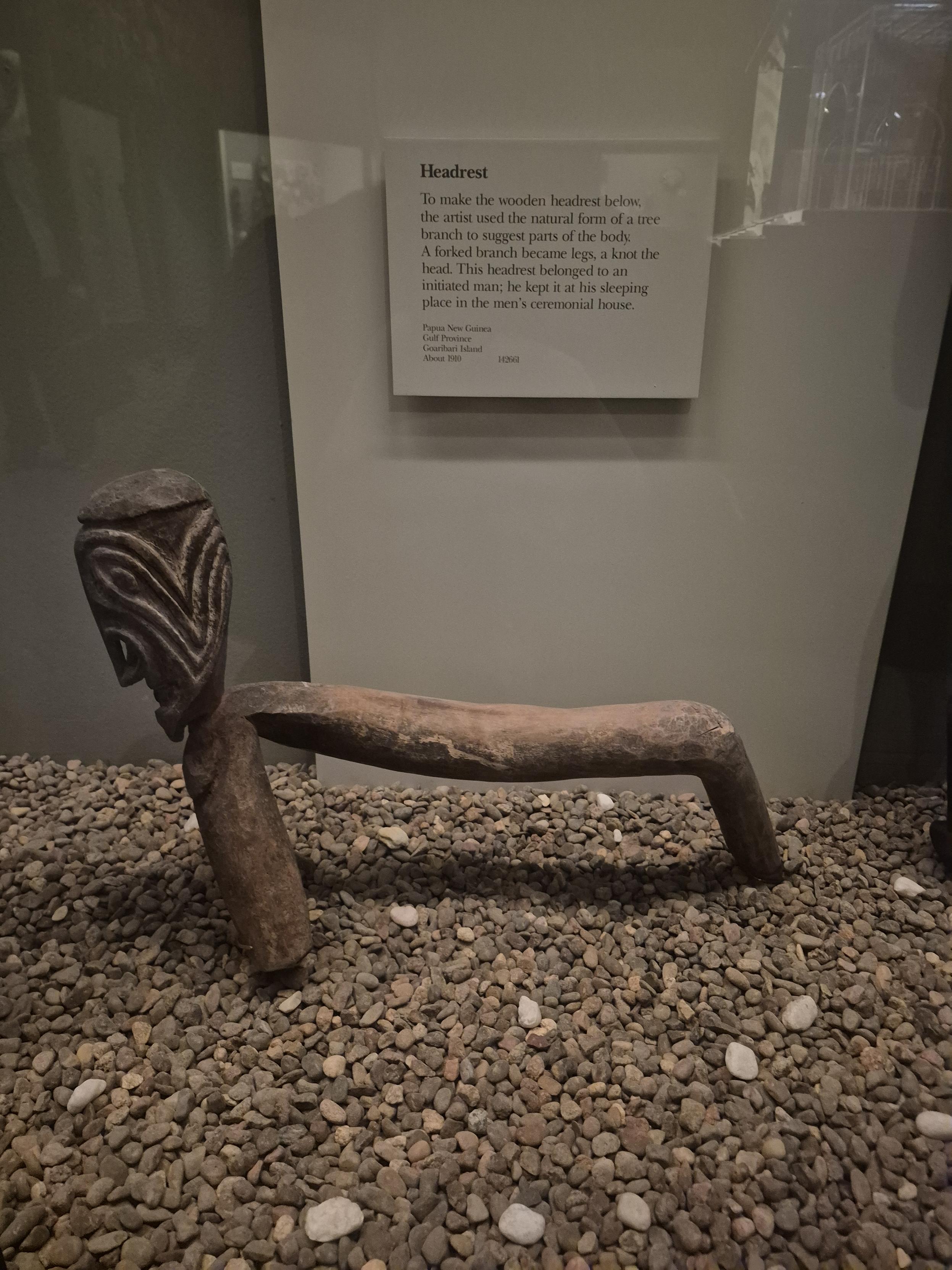To make the wooden headrest below. the artist used the natural form of a mee brauch to suggest parts of the body A forked branch became legs, a knot the head. This headrest belonged to an initiated man; he kept it at his sleeping place in the men's ceremonial house