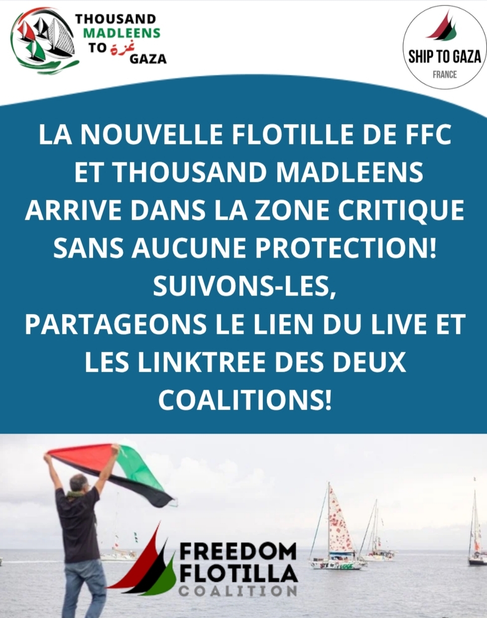 Merci à la nouvelle flottille de la #freedomflotilla et de #thousandmadleens de poursuivre le voyage pour briser le blocus et faire cesser le génocide.