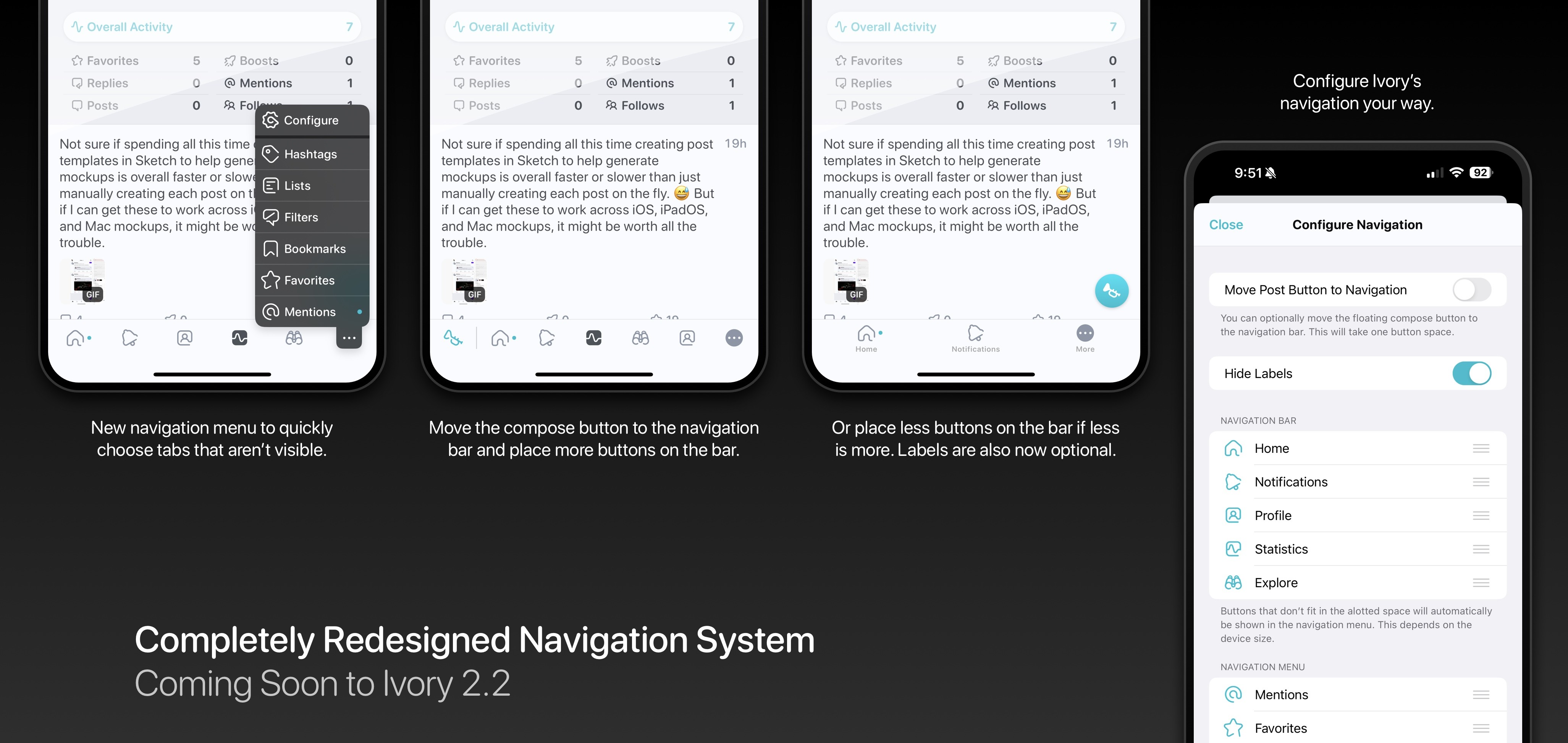 While the design of the navigation bar has changed over the years, the core concept of how it functioned has been the same since Tweetbot v1.0 way back in 2011! We've redesigned and rebuilt Ivory’s navigation system from the ground up to be faster, easier to use, and more configurable.