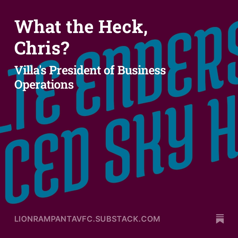 A few words on the President of Business Operations from me. Had a look back at his previous football experience and his recent interview about being at Villa. #AVFC #UTV https://open.substack.com/pub/lionrampantavfc/p/what-the-heck-chris?r=4amz63&utm_campaign=post&utm_medium=web&showWelcomeOnShare=true