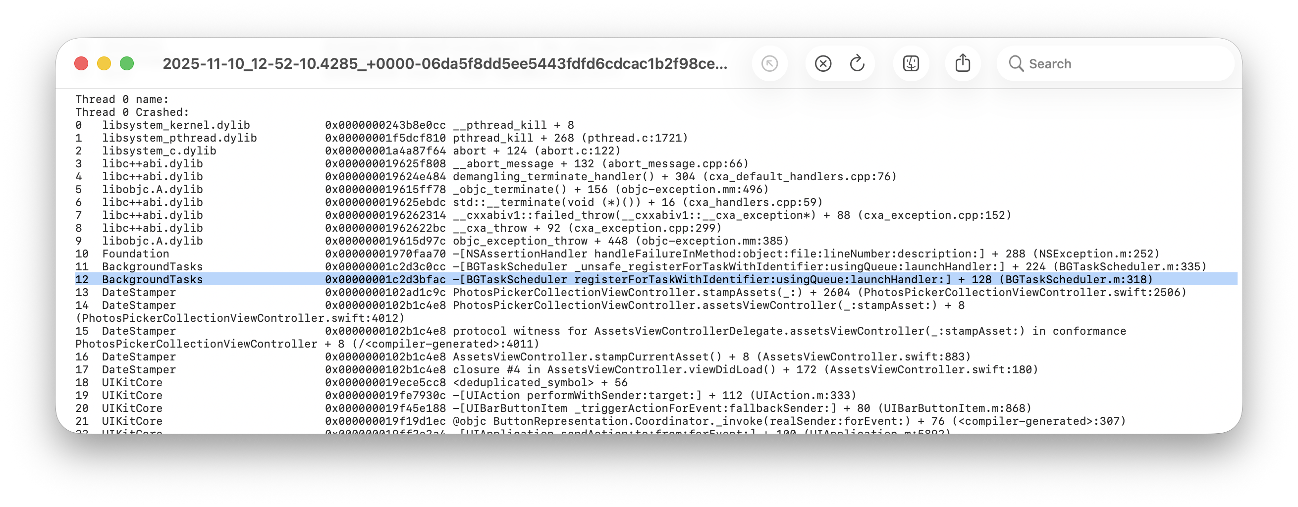 @stroughtonsmith Update: this resolved the crash. What must have happened is, since sometimes the register launchHandler closure is not invoked (https://mastodon.world/@jordanhipwell/115549174088540139), nothing happened upon tapping the start processing button, so the user must have rage tapped the button a couple times within the same second. One mystery solved ๐