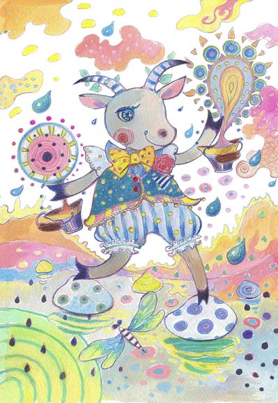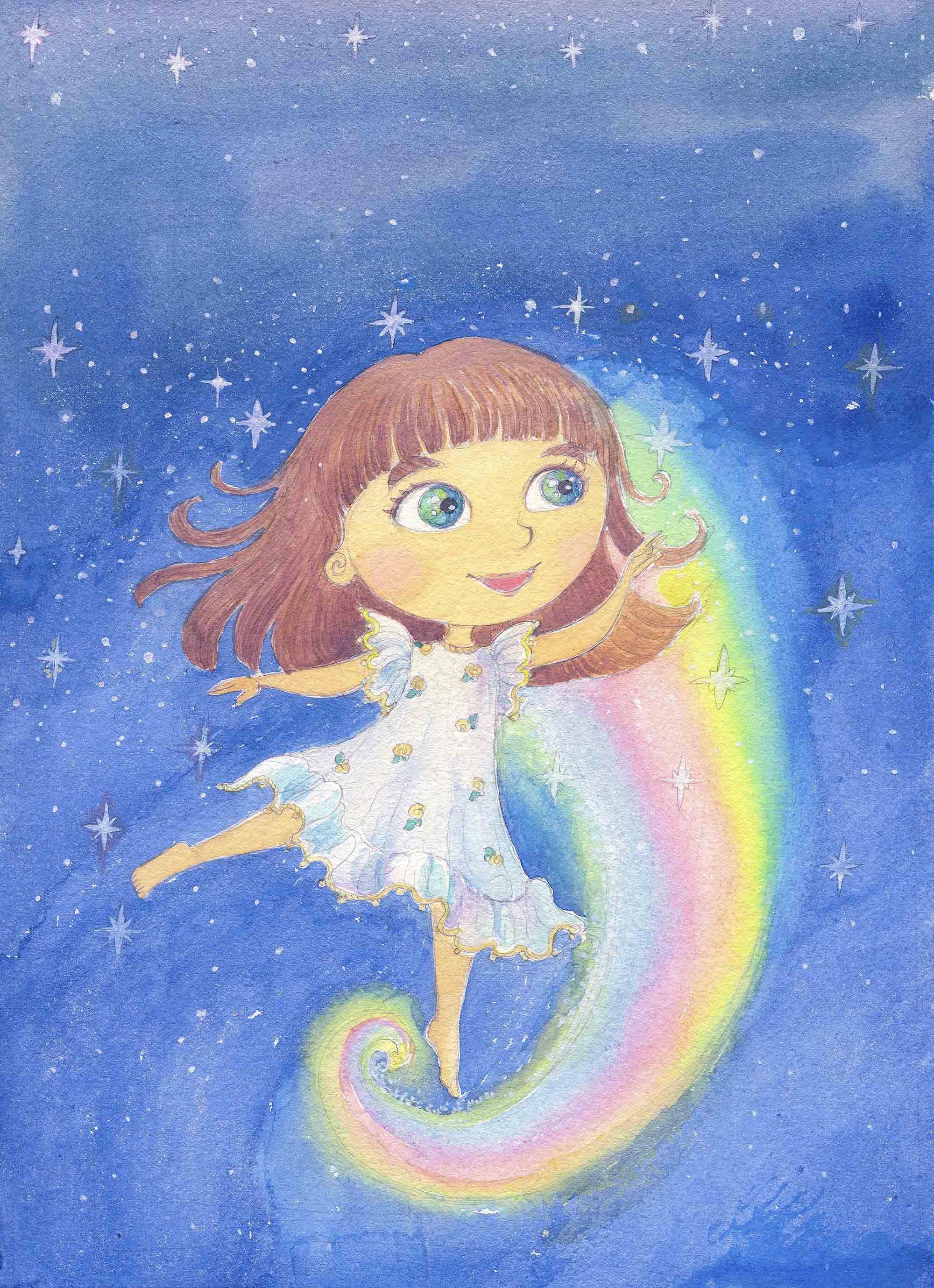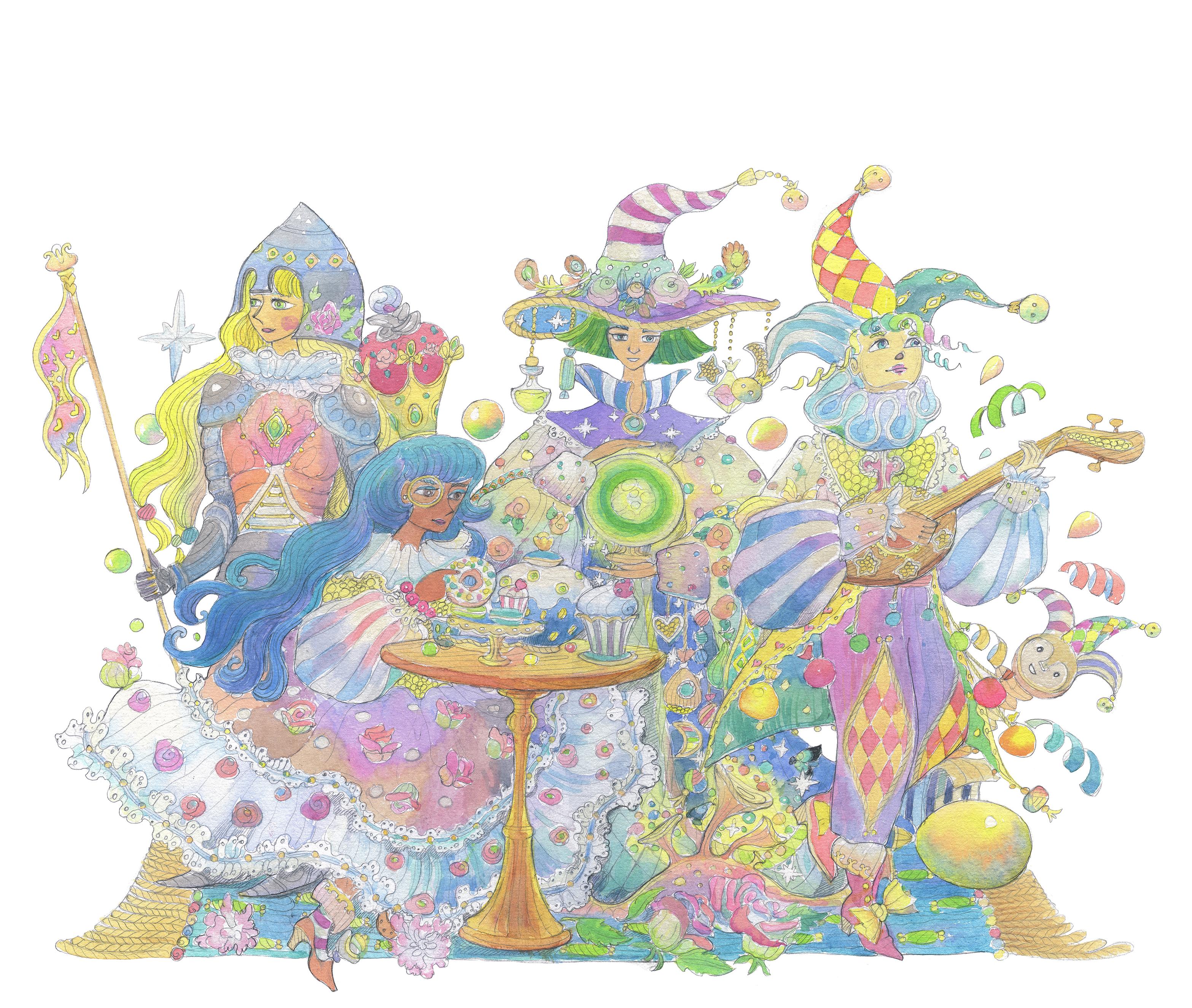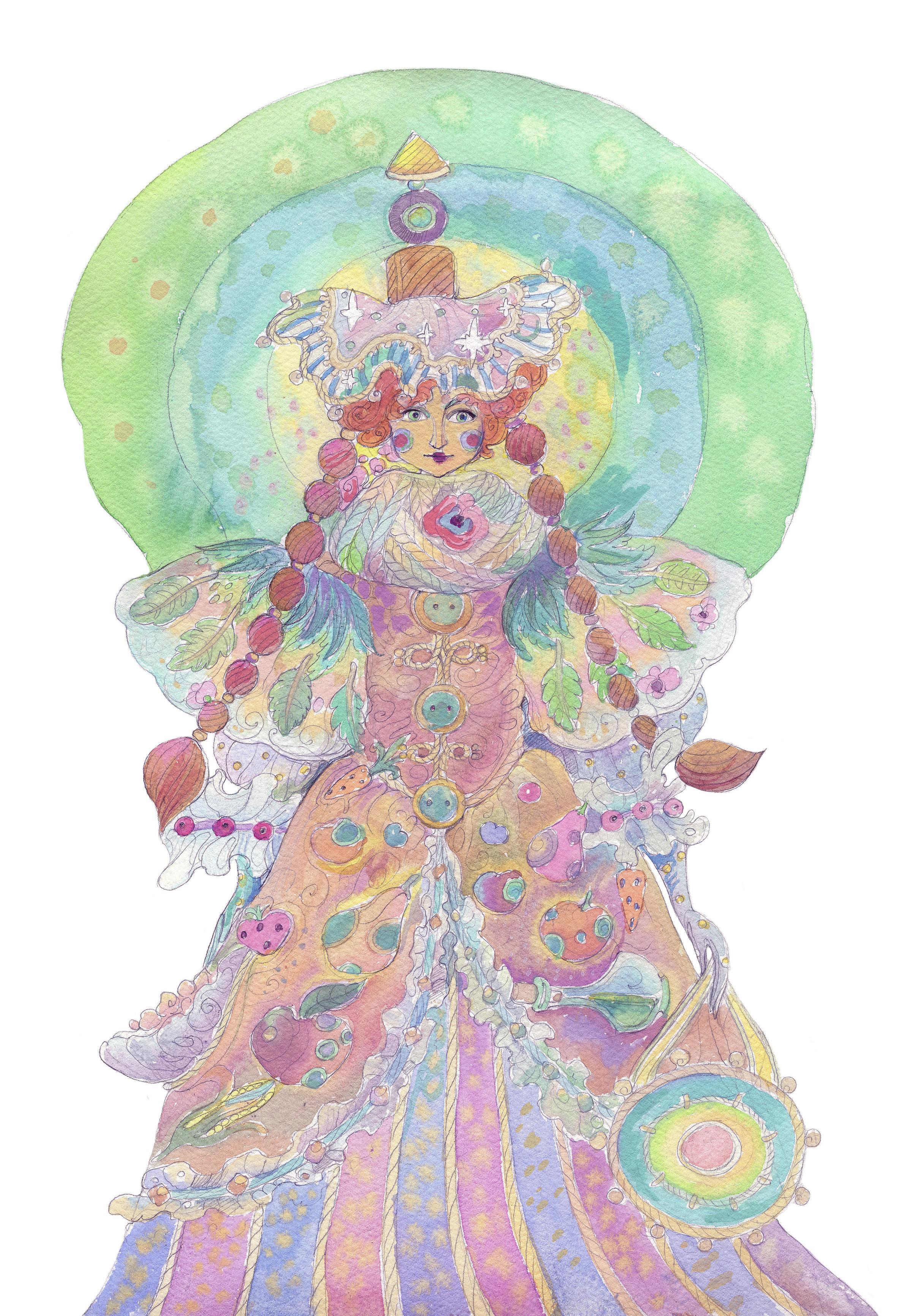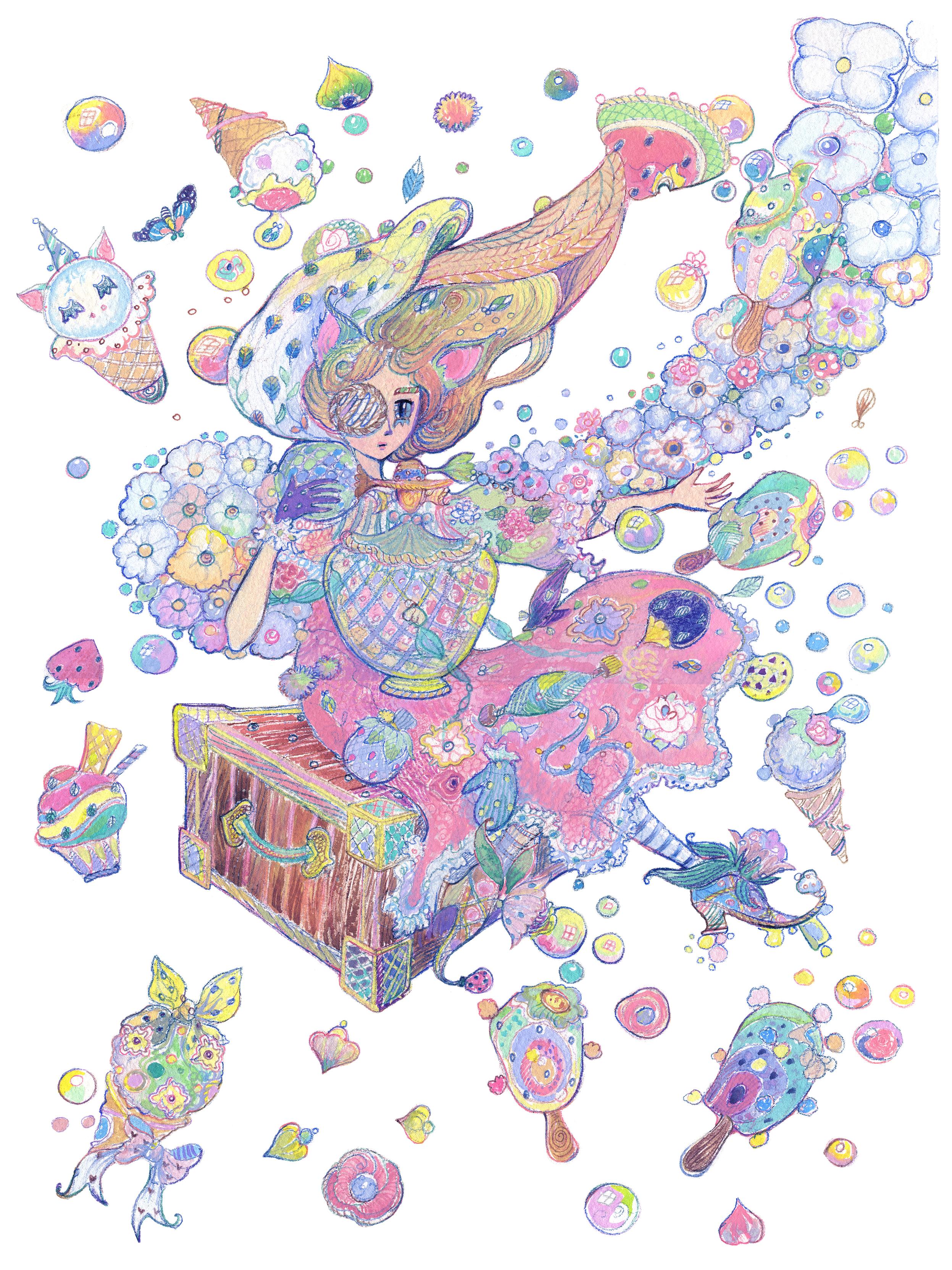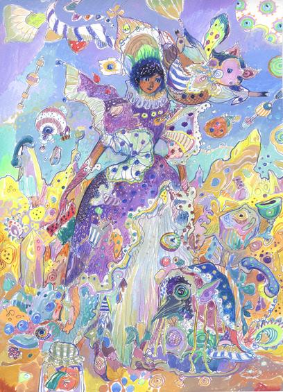The artwork was created using watercolors, coloring pencils and gouache