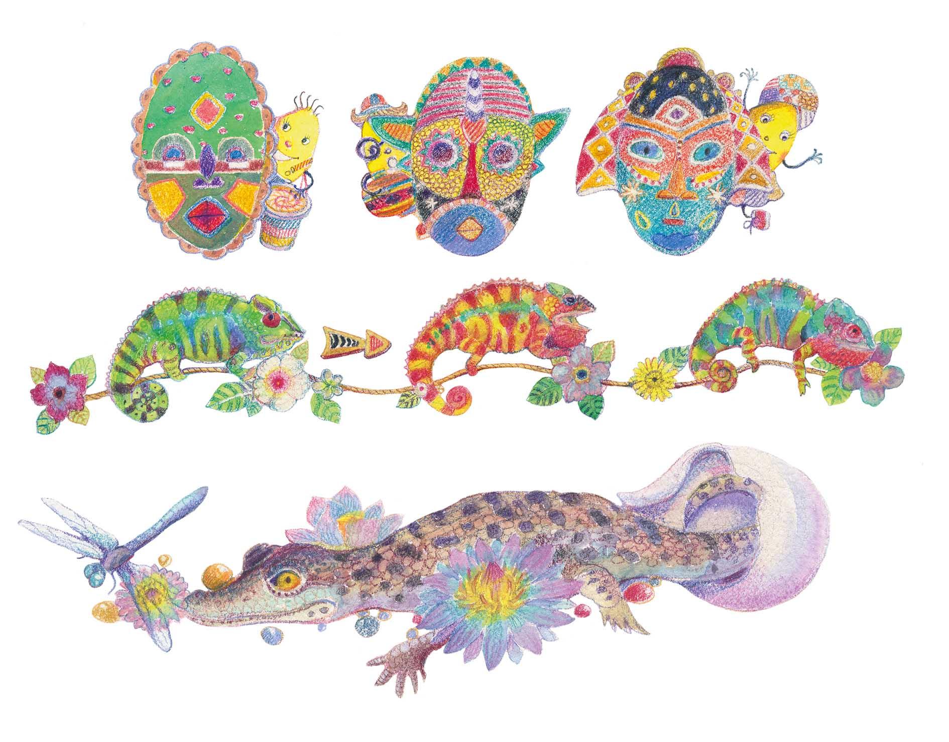 "African Masks, Chameleons changing colors and baby Crocodile"