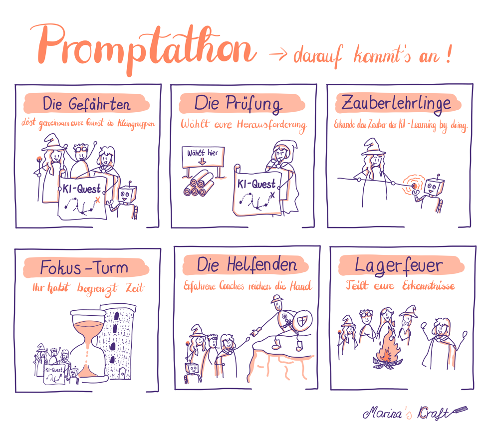 Relevanz schlägt Theorie. Teams wählen ihre Challenge, um sie während dem Promptathon gemeinsam zu bearbeiten – realitätsnah, machbar, übersichtlich. Ergebnis: Teilnehmende lösen Probleme, die so oder so ähnlich in ihrem Arbeitsalltag vorkommen.