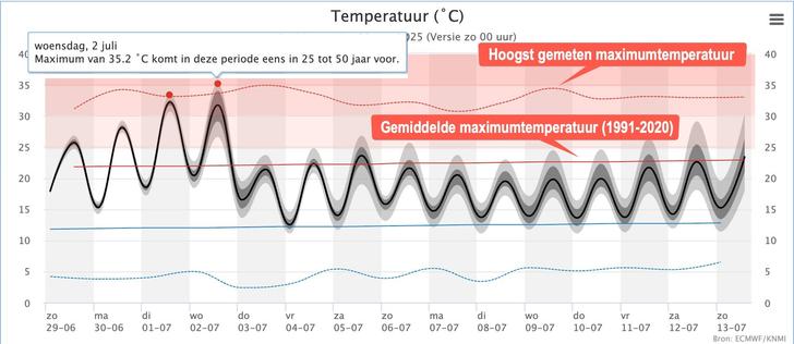 - binnen een reeks van minimaal 5 dagen boven de 25,0℃ (in De Bilt vanaf afgelopen zaterdag)