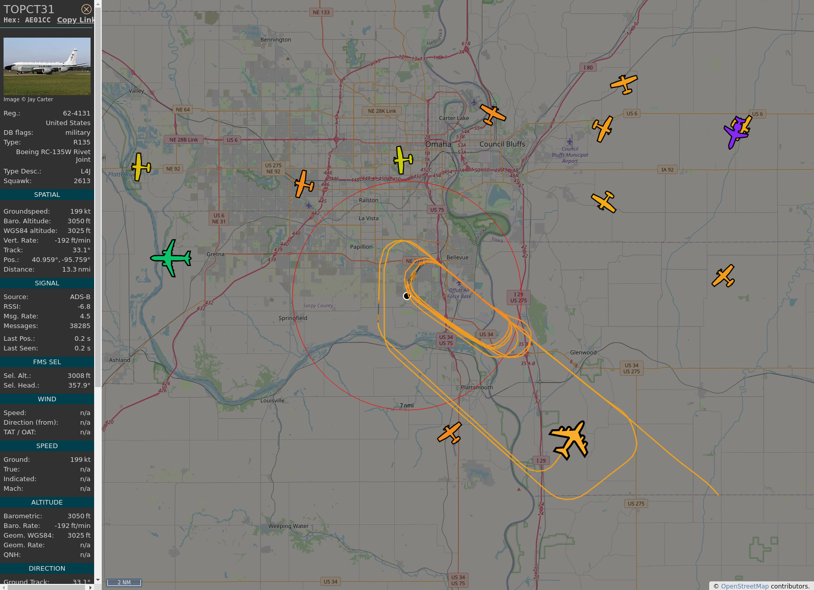 #KOMA - #TOPCT31 (RC-135W R135) United States Air Force @ 3825 ft and 17.5° frm hrzn, heading S @ 15:16:29 - https://globe.adsb.fi/?icao=AE01CC #adsb #AnyFlightTracker #rtmladsb #Bellevue Photo by: https://www.jetphotos.com/photo/keyword/62-4131