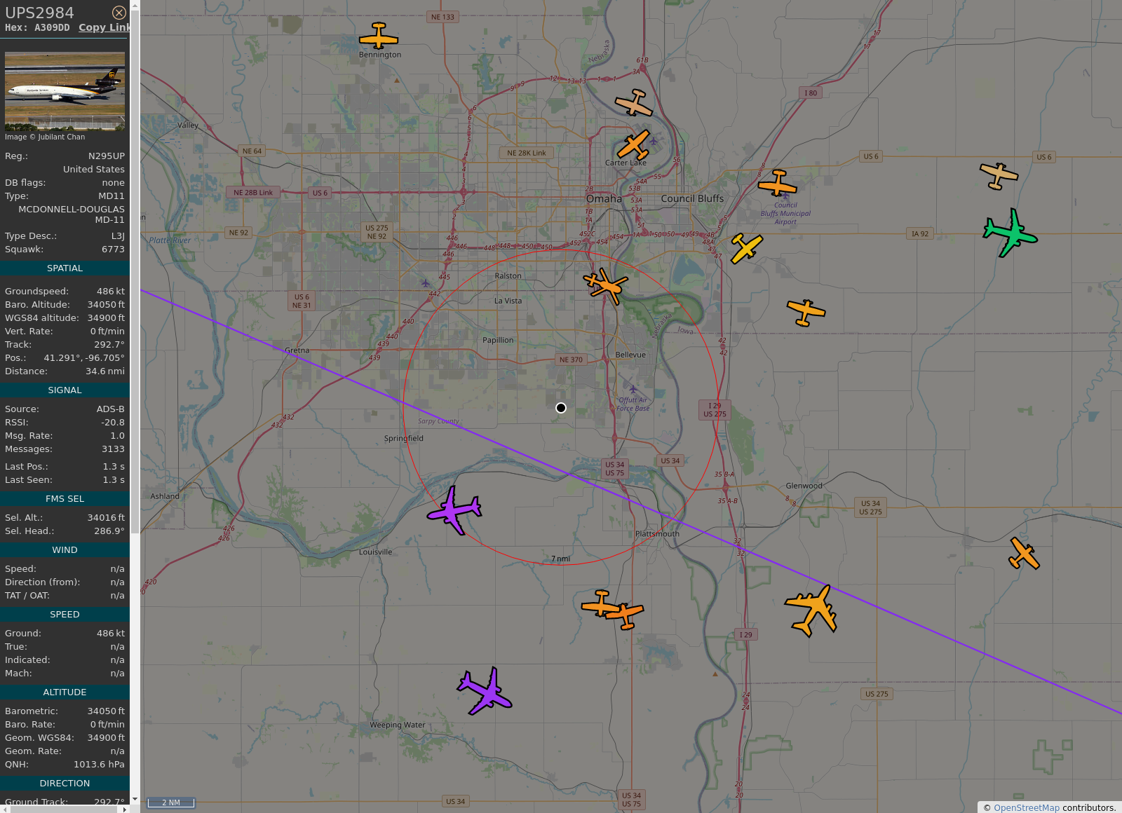 #KOMA - #UPS2984 (MD-11F MD11) United Parcel Service @ 33975 ft and 65.3° frm hrzn, heading NW @ 15:17:56 - https://globe.adsb.fi/?icao=A309DD #UpInTheClouds #adsb #AnyFlightTracker #rtmladsb #Bellevue Photo by: https://www.jetphotos.com/photo/keyword/N295UP