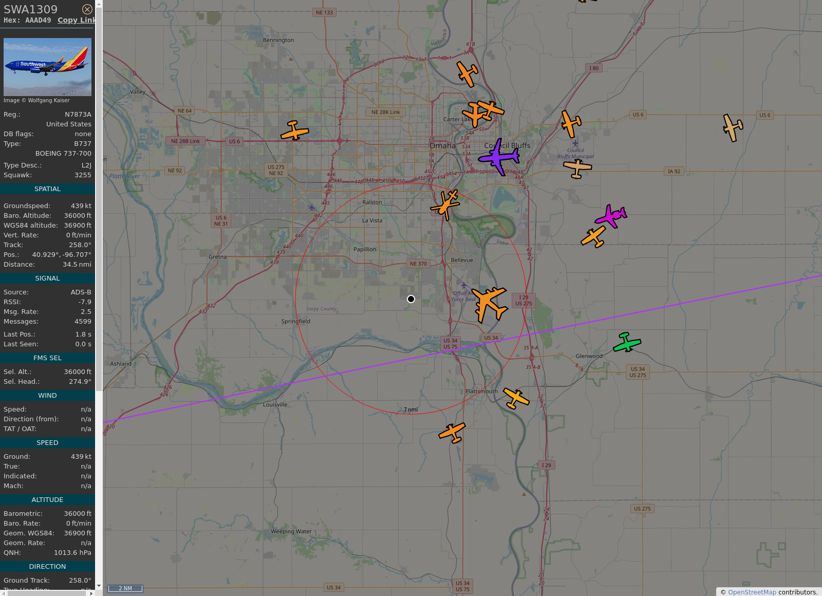 #KOMA - #SWA1309 (737-7Q8 B737) Southwest Airlines @ 36000 ft and 45.2° frm hrzn, heading W @ 15:22:10 - https://globe.adsb.fi/?icao=AAAD49 #WayTheHeckUpThere #adsb #AnyFlightTracker #rtmladsb #Bellevue Photo by: https://www.jetphotos.com/photo/keyword/N7873A