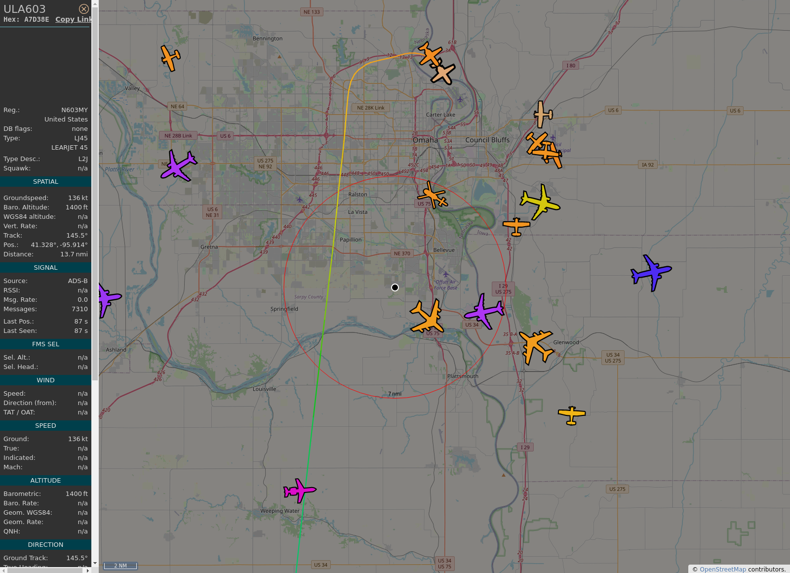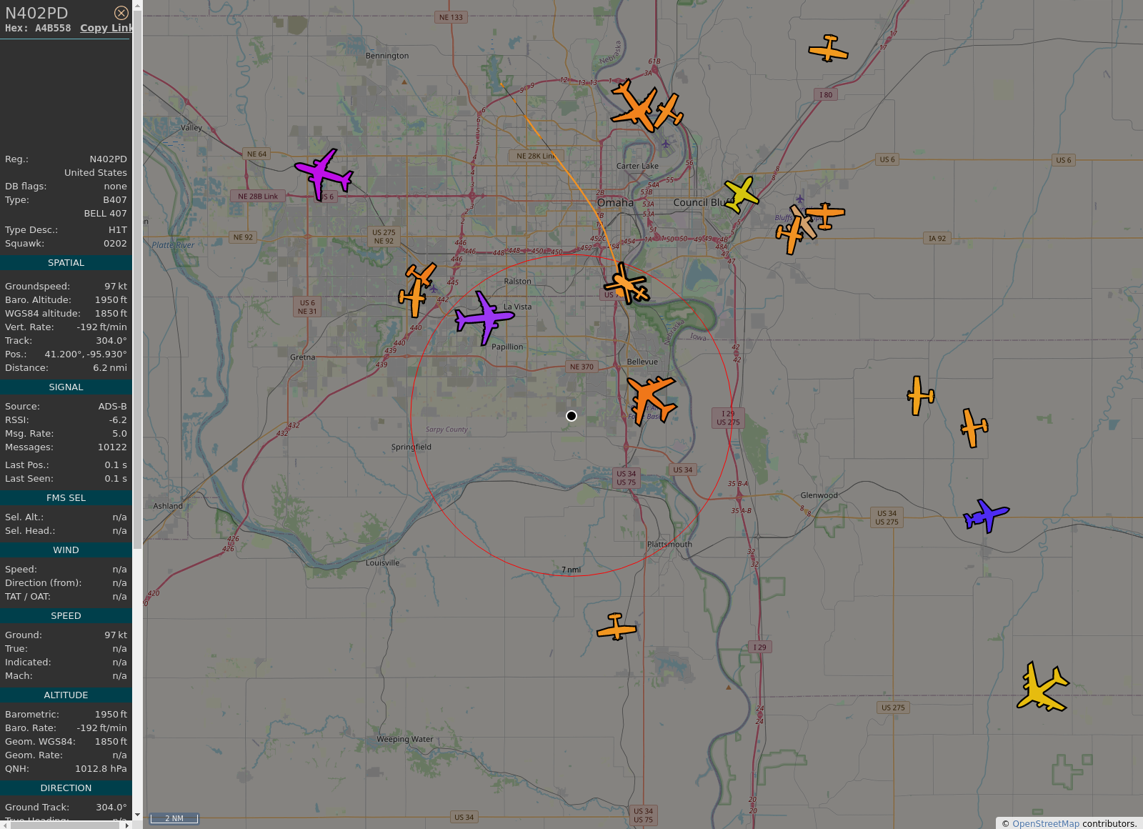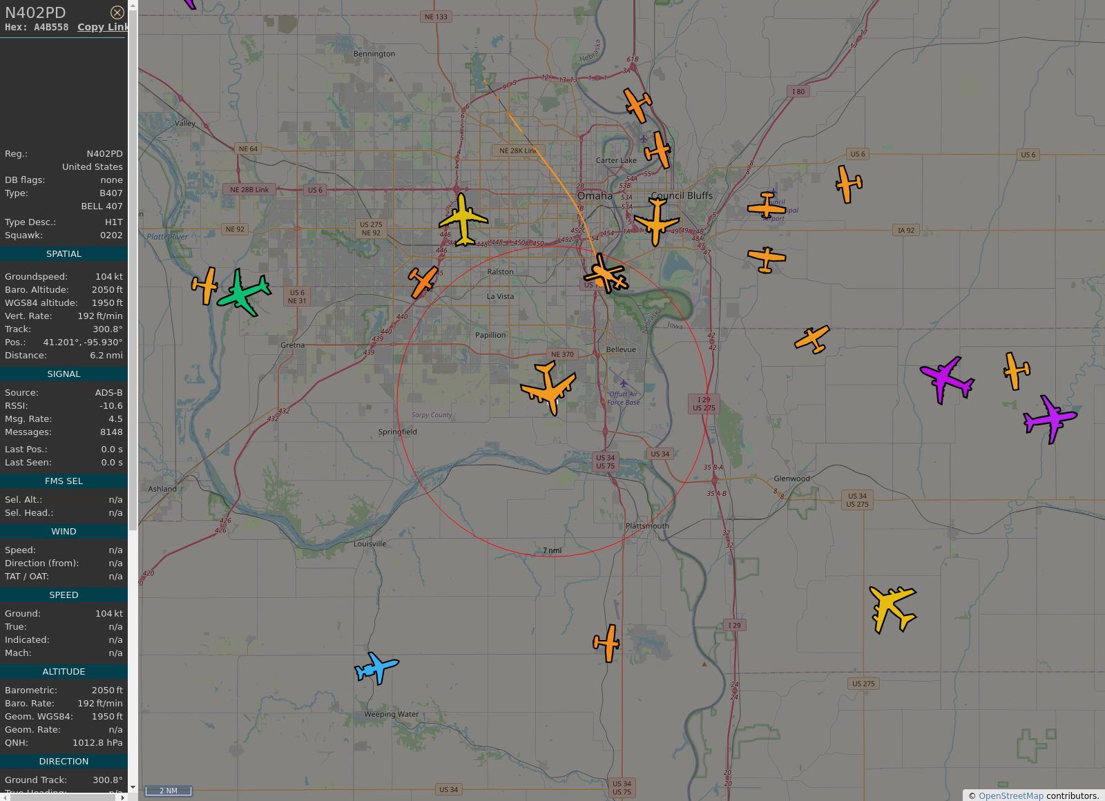 Automated BOT displaying aircraft within 10nmi of Bellevue, NE using publicly available ADSB information. This includes flight paths for Eppley Airfield and Offutt Air Force Base. Bot is automated by https://GitHub.com/ggoodloff/AnyFlightTracker