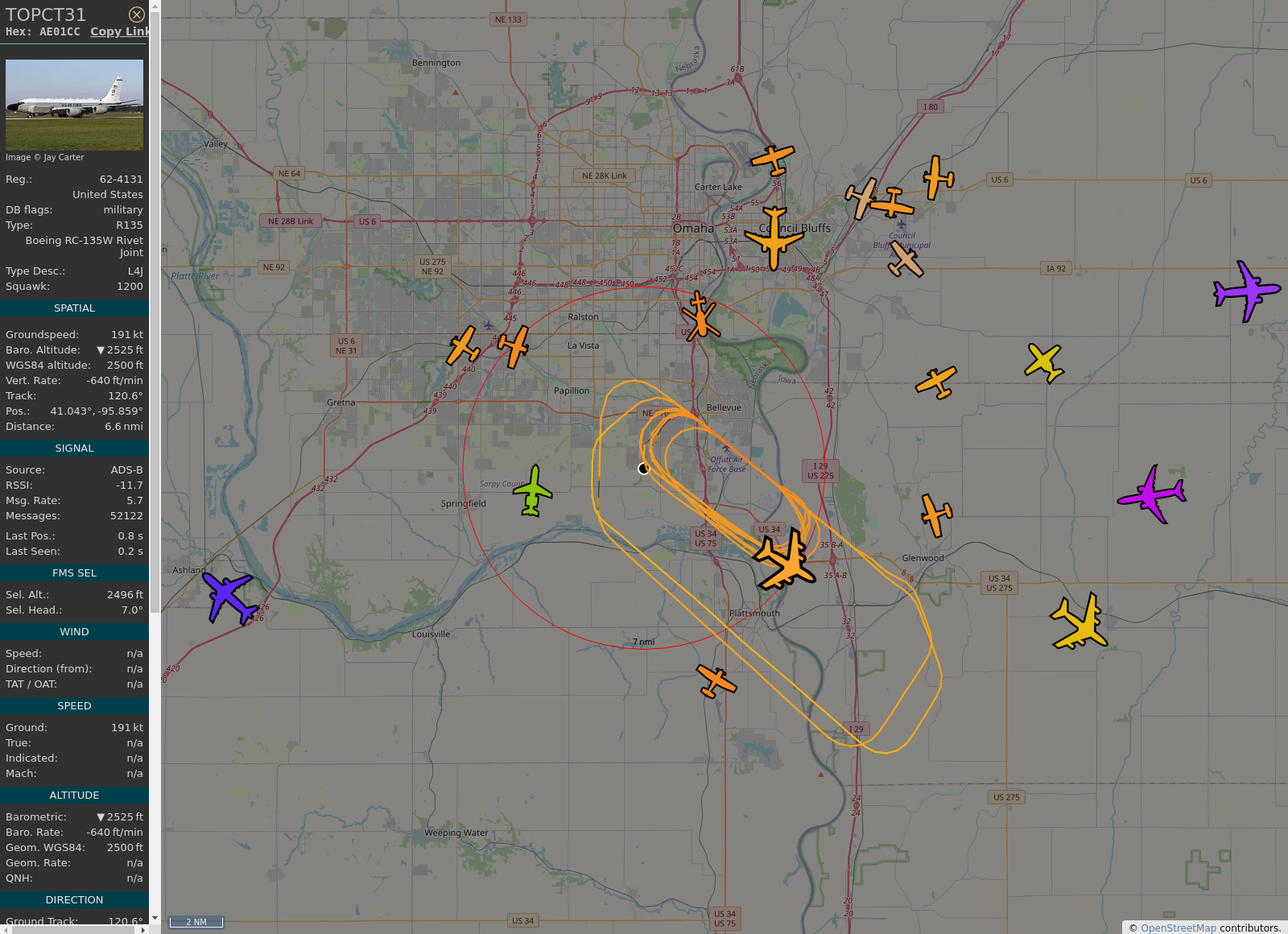 #KOMA - #TOPCT31 (RC-135W R135) United States Air Force @ 2625 ft and 9.7° frm hrzn, heading SE @ 15:48:14 - https://globe.adsb.fi/?icao=AE01CC #adsb #AnyFlightTracker #rtmladsb #Bellevue Photo by: https://www.jetphotos.com/photo/keyword/62-4131