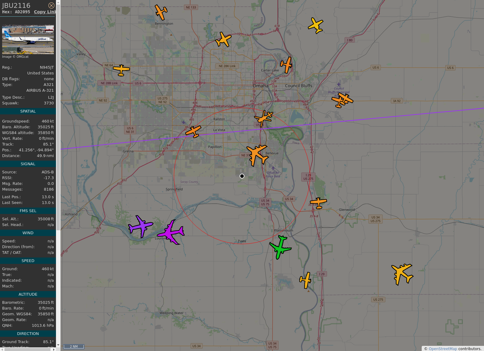#KOMA - #JBU2116 (A321-231 A321) JetBlue Airways @ 35000 ft and 43.7° frm hrzn, heading E @ 15:37:39 - https://globe.adsb.fi/?icao=AD2095 #WayTheHeckUpThere #adsb #AnyFlightTracker #rtmladsb #Bellevue Photo by: https://www.jetphotos.com/photo/keyword/N945JT