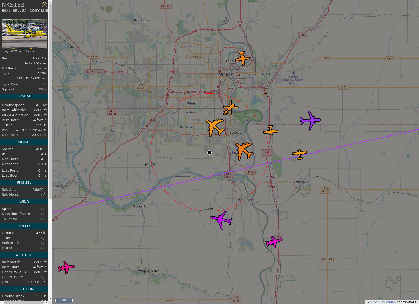 #KOMA - #NKS183 ( A20N) Spirit Airlines @ 36000 ft and 44.2° frm hrzn, heading W @ 15:48:15 - https://globe.adsb.fi/?icao=AD93B7 #WayTheHeckUpThere #adsb #AnyFlightTracker #rtmladsb #Bellevue Photo by: https://www.jetphotos.com/photo/keyword/N974NK