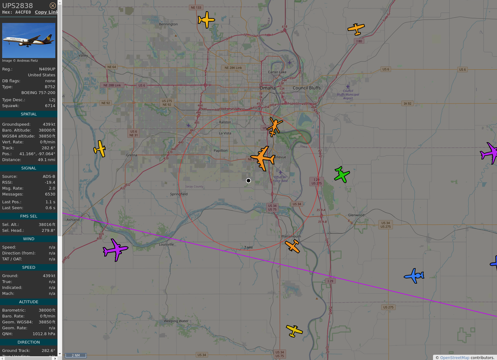 #KOMA - #UPS2838 (757-24APF B752) United Parcel Service @ 38000 ft and 36.9° frm hrzn, heading W @ 15:52:10 - https://globe.adsb.fi/?icao=A4CFE0 #WayTheHeckUpThere #adsb #AnyFlightTracker #rtmladsb #Bellevue Photo by: https://www.jetphotos.com/photo/keyword/N409UP