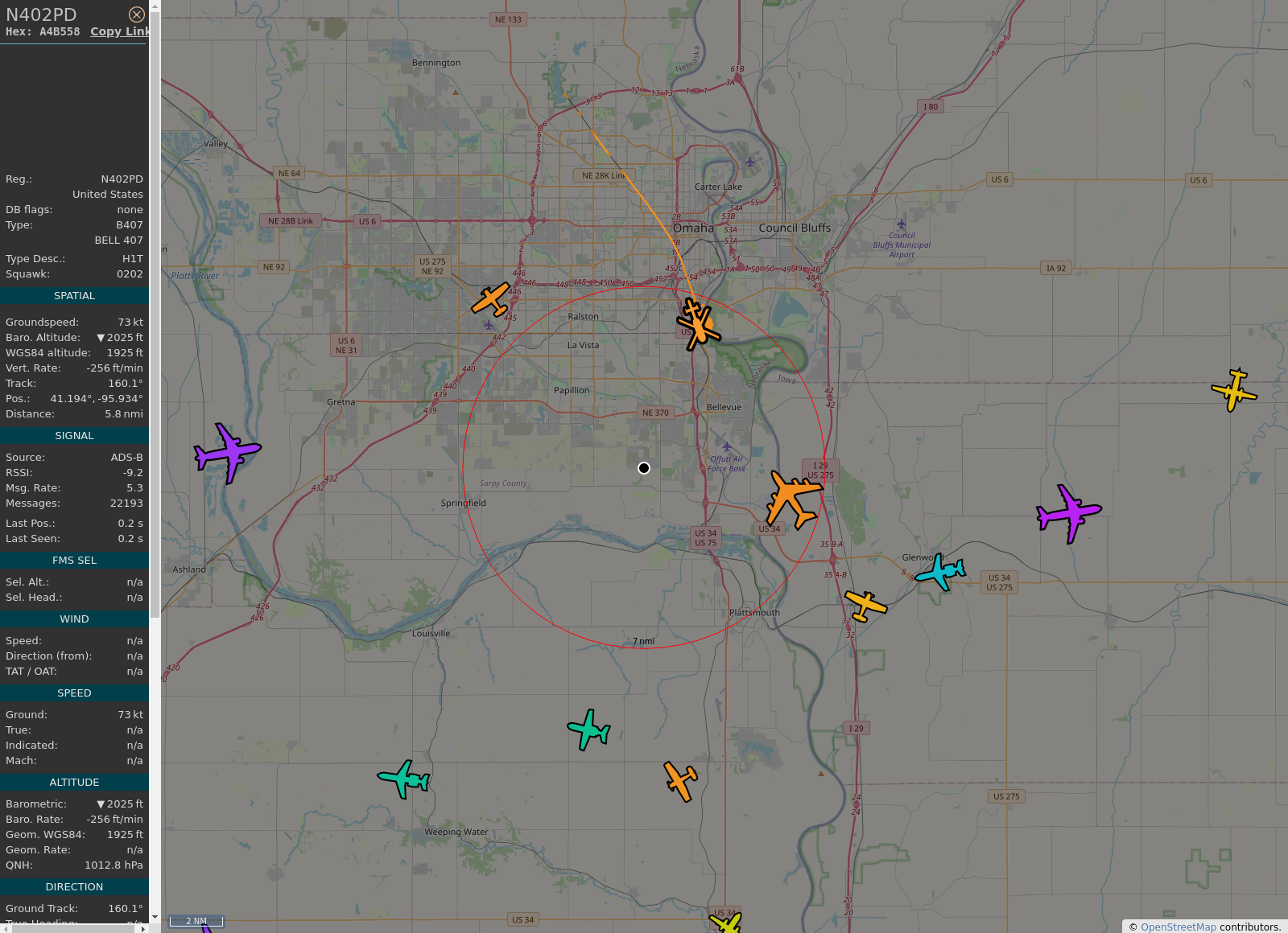 #KOMA - #N402PD (407 B407) Omaha Police Dept @ 2025 ft and 3.3° frm hrzn, heading S @ 16:07:16 - https://globe.adsb.fi/?icao=A4B558 #ProbablyLanding #adsb #AnyFlightTracker #rtmladsb #Bellevue Photo by: