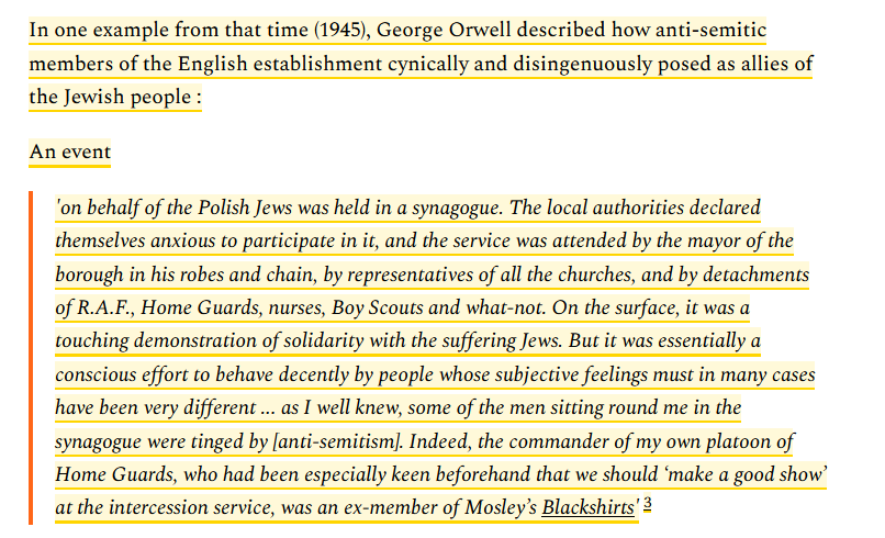 'on behalf of the Polish Jews was held in a synagogue. The local authorities declared themselves anxious to participate in it, and the service was attended by the mayor of the borough in his robes and chain, by representatives of all the churches, and by detachments of R.A.F., Home Guards, nurses, Boy Scouts and what-not. On the surface, it was a touching demonstration of solidarity with the suffering Jews. But it was essentially a conscious effort to behave decently by people whose subjective feelings must in many cases have been very different ... as I well knew, some of the men sitting round me in the synagogue were tinged by [anti-semitism]. Indeed, the commander of my own platoon of Home Guards, who had been especially keen beforehand that we should ‘make a good show’ at the intercession service, was an ex-member of Mosley’s Blackshirts'3](https://files.mastodon.social/media_attachments/files/114/913/990/246/090/147/small/274cf02b7ec4efab.png)