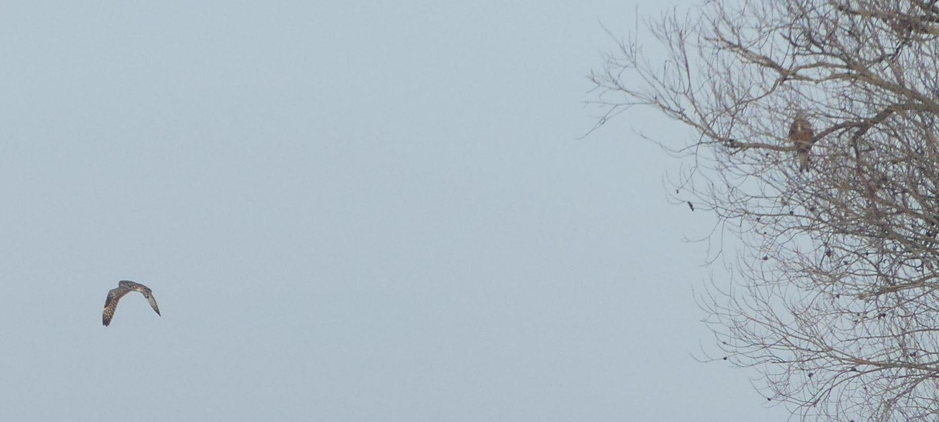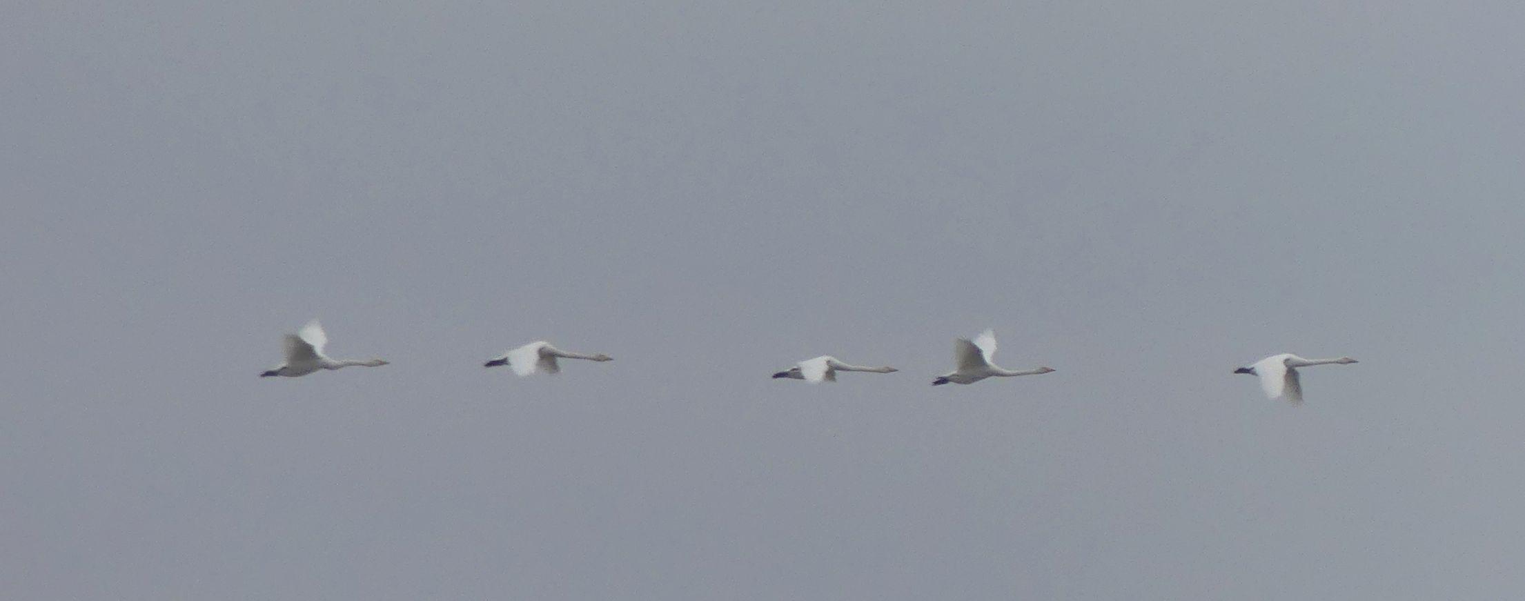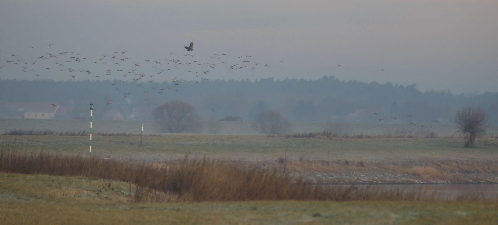 Wieder fiel der Sonnenaufgang aus, nach dem farbigen Vor-Leuchten zog es zu. Die ersten Singschwäne der Saison grüßten mit einem Liedchen und auch die Seeadler taten ihr Werk.