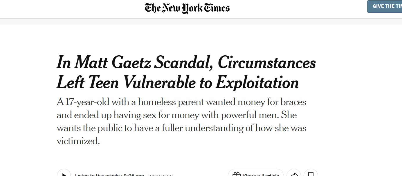 Matt Gaetz raped a 17 year old child after exploiting her healthcare needs for money and this is how the NY Times is framing it.