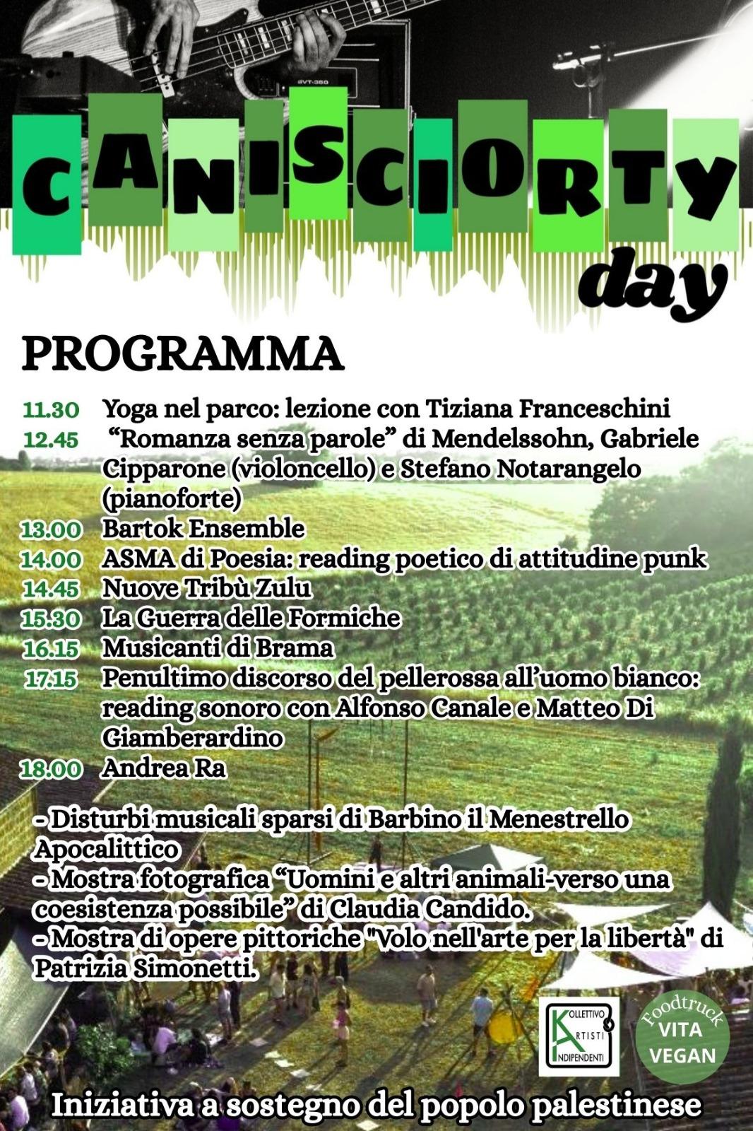 [3/3] CANISCIORTYDAY è un’iniziativa a sostegno del popolo palestinese, una giornata di concerti ed eventi che si svolge Domenica 5 Ottobre dalle 11.00 alle 20.00 presso l’Etruria Sound Lab (via Ronci 2376, Nepi, VT). Siamo in una cascina in aperta campagna, trovi da mangiare (il foodtruck di Vita Vegan) e da bere. Porta un telo e un cuscino se vuoi. Evento a cura del K.A.I. Non c’è bisogno di prenotare, ma ci fa piacere sapere se ci sarai. Info: canisciortyday@gmail.com