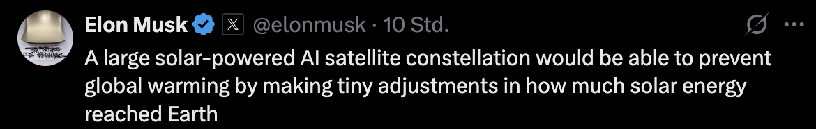 Eine richtige Besteuerung von Superreichen und Reichen, dass schließen von Steuerschlupflöchern sowie eine CO2-Steuer samt Ordnungsmaßnahmen im Klimaschutz würden die notwendigen Klimamaßnahmen finanzieren, das Leben für alle besser machen und uns die Musks dieser Welt ersparen.