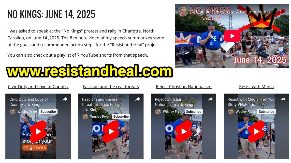 (1/4) I updated the homepage for the "Resist and Heal" project this evening, with links to several videos (including "YouTube Shorts") from my speech at the June 14th "No Kings" protest and rally in Charlotte, North Carolina: