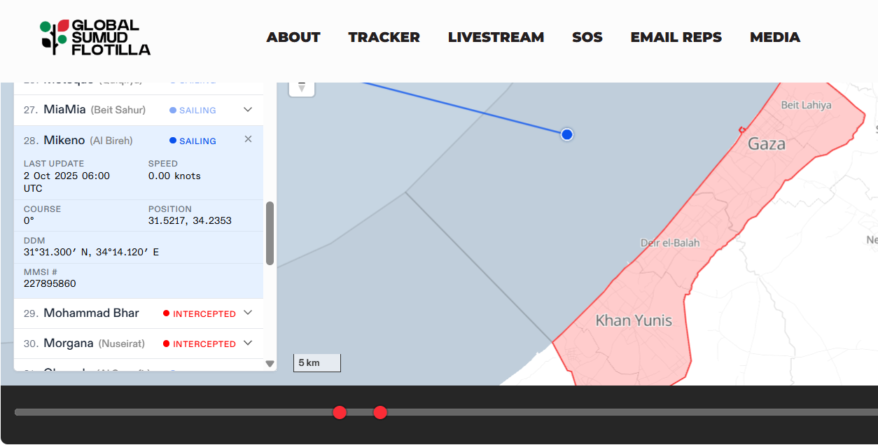 It seems only the Marinette is still sailing toward #Gaza. All other boats have already been—or are assumed to have been—illegally intercepted by Israeli forces, sanctimoniously claiming that it's the brave people of the #FreedomFlotilla, not them, who are breaking international law.