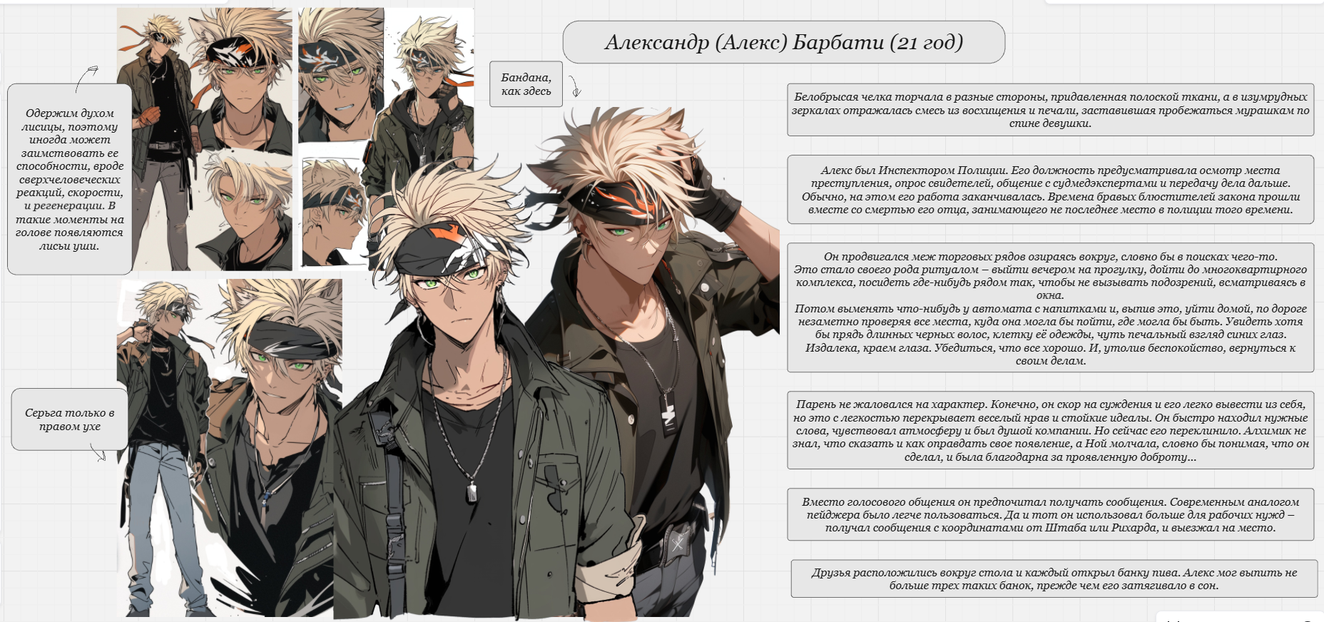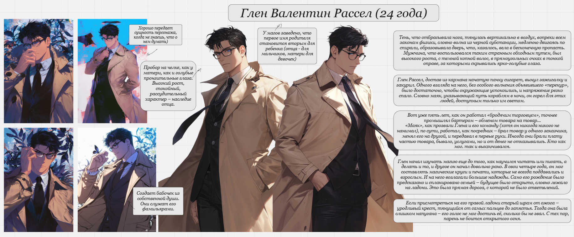 Дизайн оригинального персонажа: высокий мужчина с копной непослушных волос цвета вороньего крыла и карими глазами. Одет в белую рубаху и черные брюки.Дизайн оригинального персонажа: высокий мужчина в очках. Брюнет с голубыми глазами. Одета в деловой костюм и бежевый плащ в пол.Дизайн оригинального персонажа: молодой парень в бандане на рокерский манер. Крашенные светлые волосы, зеленые глаза. Одет в миллитаризированную куртку и джинсы.