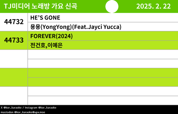 #TJ #노래방신곡 #가요 #김홍남 #태민(TAEMIN) #용용(YongYong) #스키니브라운 #우디 #BE'O(비오)(Feat.Paul_Blanco) #ONSEEON(온시온) #알레프(ALEPH) #Gist(Feat.미노이) #새소년