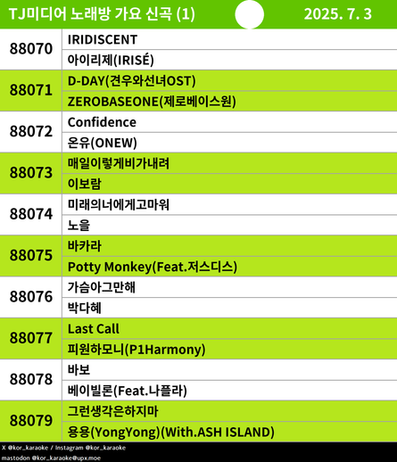 #TJ #노래방신곡 #가요 #아이리제(IRISÉ) #ZEROBASEONE(제로베이스원) #온유(ONEW) #이보람 #노을 #PottyMonkey(Feat.저스디스) #박다혜 #피원하모니(P1Harmony) #베이빌론(Feat.나플라) #용용(YongYong)(With.ASHISLAND)