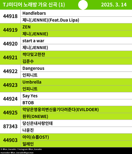 ๋Œ€ํ•œ๋ฏผ๊ตญ ๋…ธ๋ž˜๋ฐฉ ์‹ ๊ณก ์•Œ๋ฆผ (TJ,๊ธˆ์˜)kor_karaoke@upx.moe