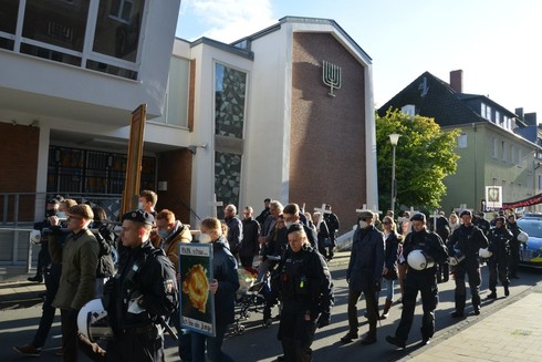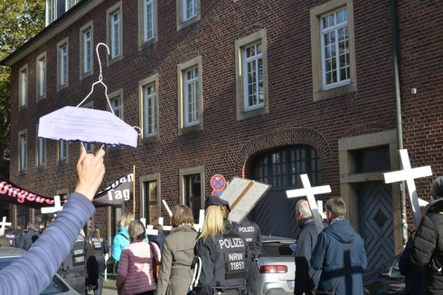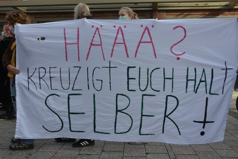 Zur gleichen Zeit waren gerade die Fundis mit ihrer Messe in der Aegidiikirche fertig. Dort verbrachten sie eine Stunde auf dem Kirchplatz, welcher ringsum abgesperrt war und von Skandiersprüchen der Gegendemonstrant*innen erfolgreich begleitet wurde. Für allgemeine Belustigungen sorgten z.B. "Hätt Maria frei entschieden, hätt sie Jesus abgetrieben", "Maria hat gefickt" und "Für mehr Analverkehr!".