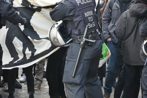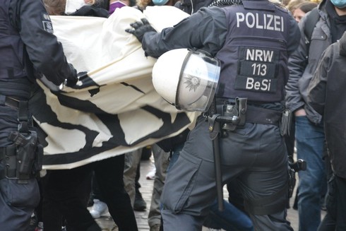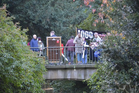 Um 15:30 zogen die Fundis durch die Innenstadt los, skandierende Gegendemonstrant*innen gingen mit. Außerdem kam es dort zu Sitzblockaden.