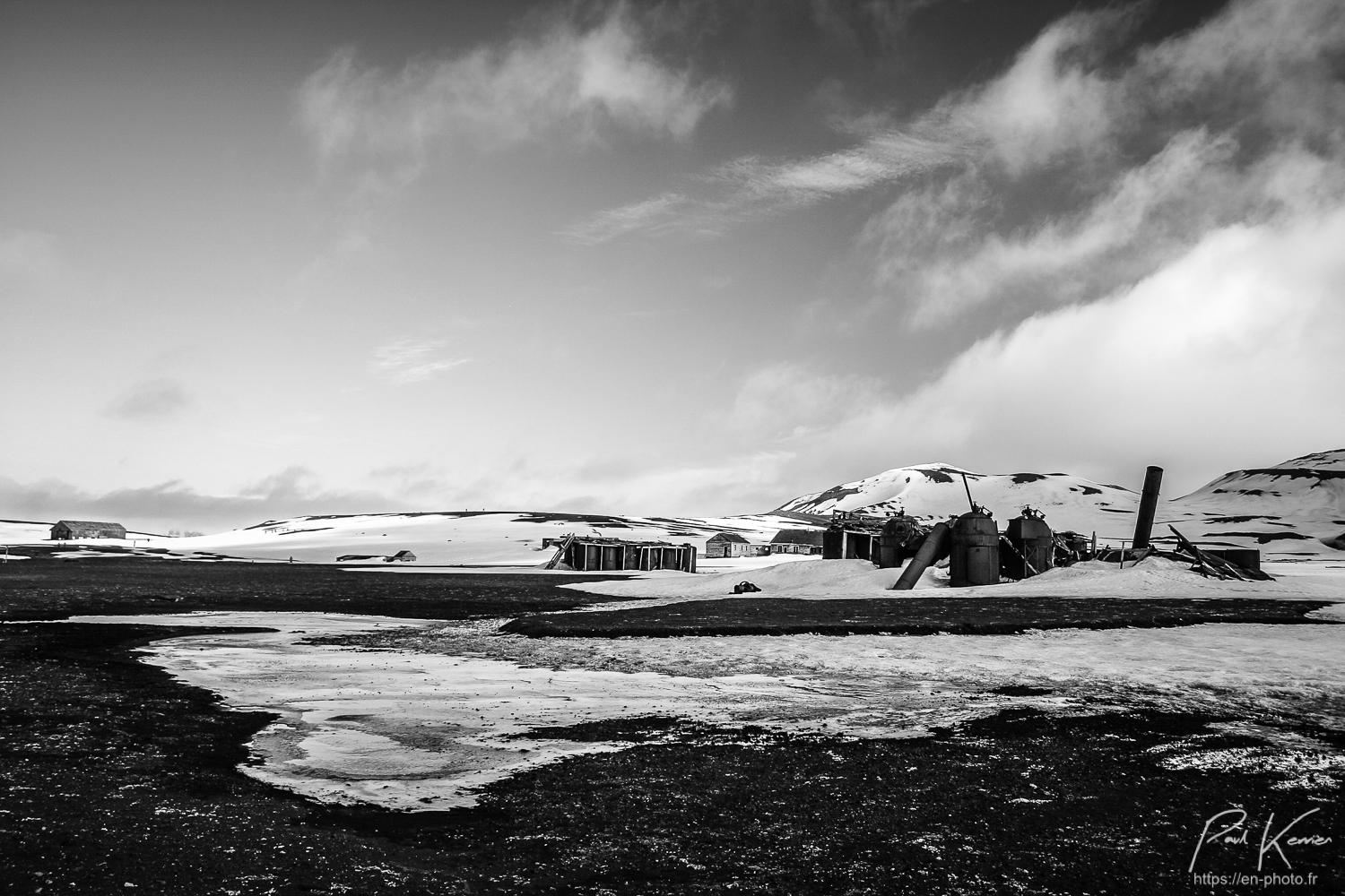 Au dessus de cette piste, différents quartiers de l'ancienne station baleinière encore sous la neige avec ici des réservoirs cylindriques de 10m de haut, là des logements, plus loin des ateliers en bois et un peu à l'écart, au dessus, le cimetière."