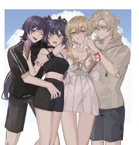#2boys #2girls #albedo_(genshin_impact) #alternate_costume #black_camisole #black_choker #black_shirt #black_shorts #blonde_hair #blush #breasts #brown_hoodie #camisole #choker #contemporary #couple #crepe #dress #food #genshin_impact #green_eyes #hetero #highres #holding #holding_crepe #holding_food #hood #hoodie #hug #hug_from_behind #ice_cream #ice_cream_cone #long_hair #lumine_(genshin_impact) #medium_breasts #mona_(genshin_impact) #multiple_boys #multiple_girls #one_eye_closed #open_mouth #parted_lips #piercing #pij_(aoiirooto) #purple_eyes #scaramouche_(genshin_impact) #shirt #short_hair #shorts #smile #tongue #tongue_out #tongue_piercing #twintails #v-shaped_eyebrows #very_long_hair #white_dress #wiping_face https://danbooru.donmai.us/posts/6041813