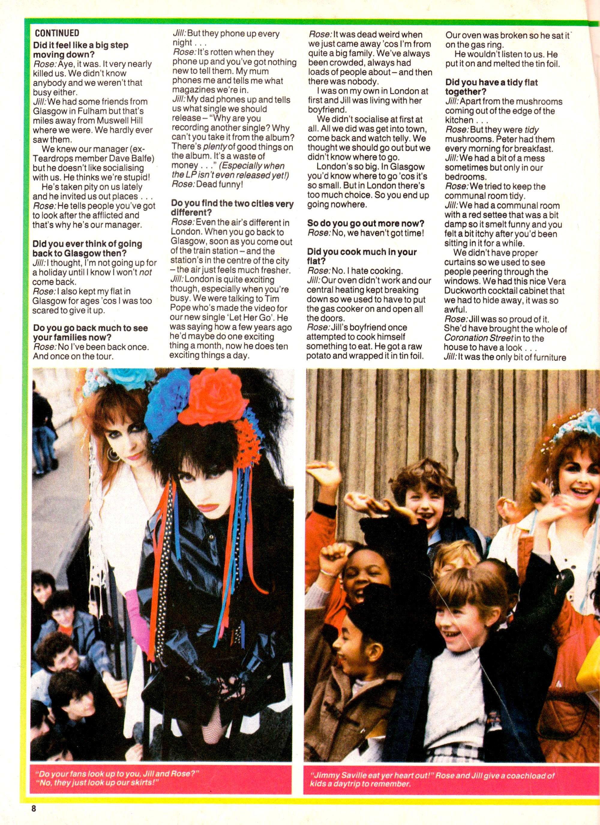 ![First page of a three page feature, headlined 'Let Her Go Out' and intro reading 'Eighteen months ago Strawberry Switchblade moved from Glasgow to London. They got a grotty flat in Muswell Hill and sat in it. Not a great start, you might think. But Jill McDowall [sic] suffers from agoraphobia - a fear of the outdoors - and Rose Bryson [sic] wasn't going out by herself. So how come they're now standing on top of St Paul's Cathedral being photographed by John Stoddart? Paul Simper tries to find the courage to go up there and ask them'](https://files.mastodon.social/cache/media_attachments/files/114/210/854/850/282/942/small/fa1efa6af5ebc38c.jpg)