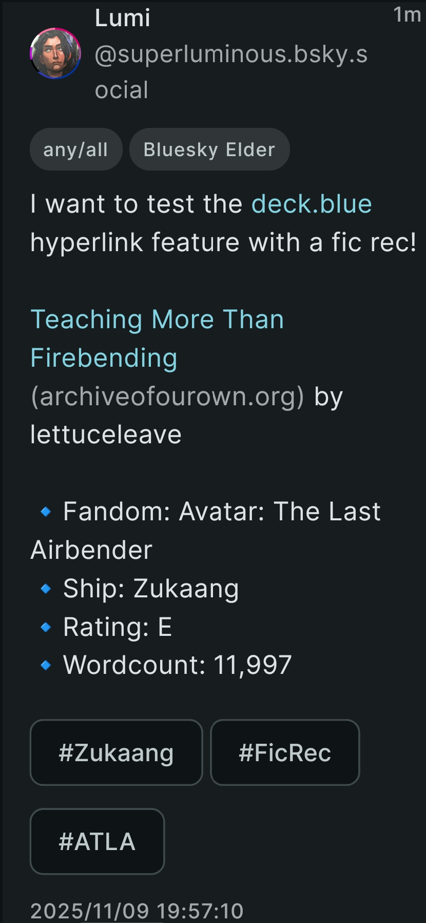 I want to test the deck.blue hyperlink feature with a fic rec! Teaching More Than Firebending by lettuceleave 🔹Fandom: Avatar: The Last Airbender 🔹Ship: Zukaang 🔹Rating: E 🔹Wordcount: 11,997